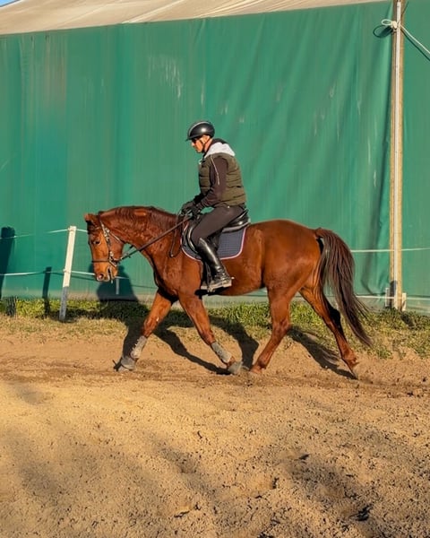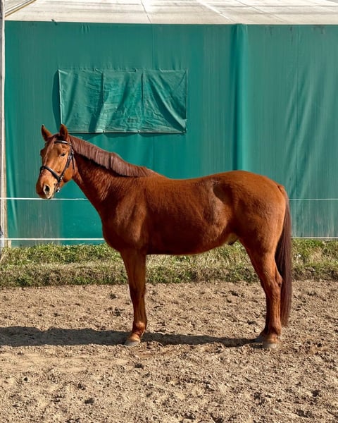 A 5-year-old Kisbér-bred gelding is looking for a new home. He takes contact easily, changes lead in canter over poles at a basic level, is brave in jumping work, and performs the exercises at the requested pace. When free jumping, he shows exceptional talent, and under saddle he lifts himself nicely; he is also characterized by light, clean basic gaits. His sire competed at 1.10 m, and his dam sire competed at 1.30 m. From the ground he is also a real sweetheart: easy to tie, lead, gives his legs, and is very people-oriented. I recommend him as a first horse, as well as for leisure competitions, show jumping, and dressage; he would certainly also do well in eventing. He can be tried in Budapest by prior appointment.