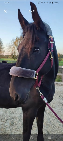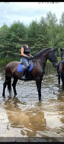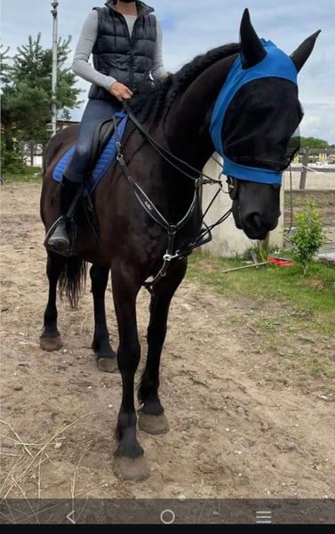 A charming 8-year-old Kladruber-Friesian gelding with exceptional movement and temperament. Standing over 170 cm (16.1 hh), he is strongly built and also well-suited for an experienced rider. He is a real cuddle buddy, loves human contact, and is easy to handle with the farrier and veterinarian. Regularly vaccinated, dewormed, and shod. He is a forward-going horse, sensitive to aids, and gentle in the mouth. Riding him is very comfortable and pleasant. He does not weave, crib, or swallow. He jumps comfortably at 70–80 cm. His elevated hindquarters make him suitable for dressage and driving. The horse is currently located in the Czech Republic. Included in the price are bridle, breastplate, and saddle.