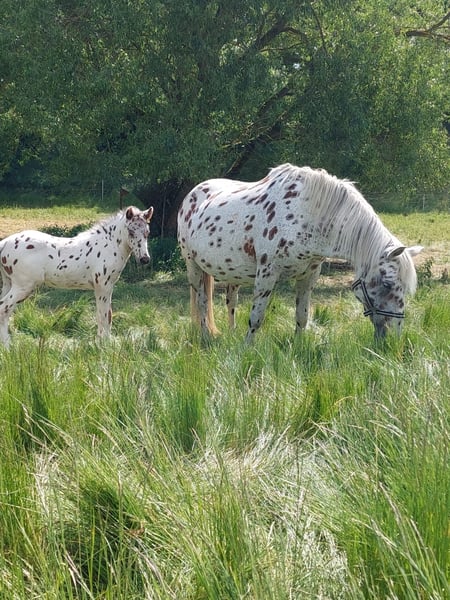 A loving and beautiful mare that takes some time to build trust. She has no health issues but likely experienced negative encounters in her past, so we do NOT consider her suitable as a riding horse. She walks calmly alone and responds well to lunging. She is still somewhat unsure during ground work when approached closely but will step back and does not become confrontational. She is familiar with saddle and bridle and can bear a rider’s weight. We have worked extensively with her; she now accepts having her hooves picked out very well. Loading into the trailer and traveling is no problem. She has already had two wonderful foals and is an excellent mother. She is lower in the herd hierarchy and avoids conflicts. If you are looking for a mare in a special color for breeding or a companion horse (retraining her for riding might be possible but would be a very long process), she could be the right choice. Only to a loving home, preferably with a contract. Further information, videos, and photos available only via phone or WhatsApp.