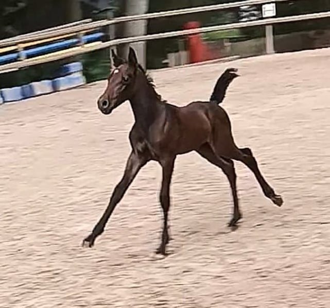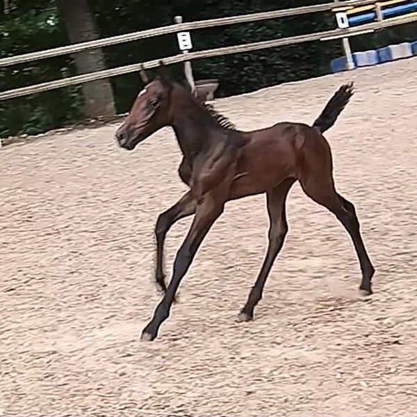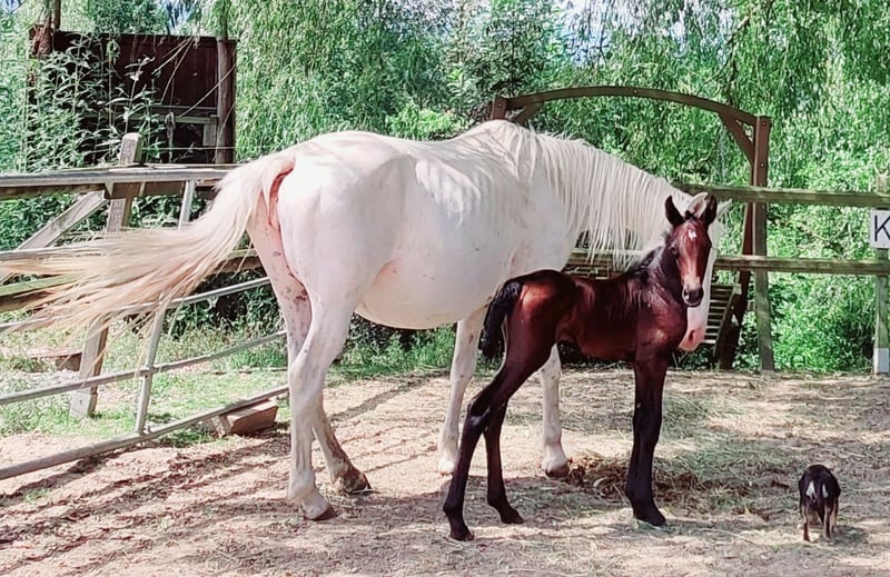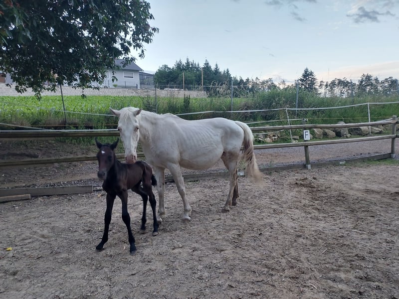 Pa' Dora Diamant af Eichlgütl. Eingetragen beim ZfdP. Vater: Knabstrupper, ZfdP Hengstbuch 2, Benz' Indiana Jones mit alten dänischen Blutlinien, die bis ins 18. Jahrhundert zurück reichen. LP/Lp, PATN1/Patn1. Mutter: Knabstrupper, Pippi, beim ZfdP eingetragen. LP/Lp. Die Farbentwicklung Doras ist noch nicht absehbar. Dora Diamant, benannt nach der letzten Freundin Franz Kafkas, geboren im Kafka-Jahr (17.06.2024) ist ein Stutfohlen mit hoher Menschenbezogenheit und ausgesprochen guten Nerven. Sie geht bereits selbstständig in den Pferdehänger, kennt Baden im Fluss und ist auch sonst völlig unerschrocken. Knabstrupper-typisch hat sie einen sehr klaren Kopf und auch den typischen Eigenwillen. Sie wächst seit ihrer Geburt in einer Herde mit ihrer Mutter (Leitstute) und mehreren anderen jungen Pferden in Offenstallhaltung auf. Aufgrund ihrer Gelassenheit wäre sicherlich auch gut ein Einsatz als Therapiepferd denkbar. Die Eltern haben Beide, insbesondere der Vater eine sehr gute Dressurveranlagung. Der Vater befindet sich im Besitz der Oliveira Stables. Wir bieten darüber hinaus einen sehr günstigen Aufzuchtsplatz (140 Euro pro Monat) an. Bei ehrlichem Interesse bitte gerne Zuschriften mit einer kurzen Vorstellung, wie wir uns die Zukunft von Dora bei Ihnen vorstellen können oder Sie rufen einfach an. Telefon 0177-4816901. Auf dem letzten Foto ist der Vater zu sehen. Die anderen Fotos zeigen Dora von ihrer Geburt bis zum jetzigen Zeitpunkt.