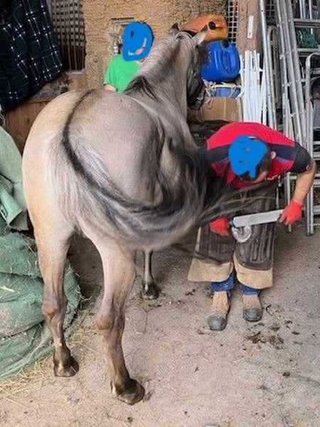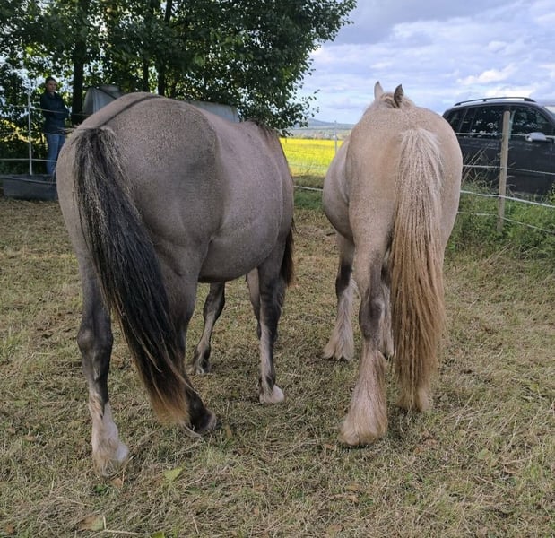Grisu ein toller dunkler Grullo sucht neuen Besitzer. geb. 5/ 24 , z.Zt. 1,37m hinten mächtig überbaut mit EM um 1,45m evtl. + ( Haffiformat), quadratisch praktisch gut, kompakt, deckt später auch Erwachsenen Reiter ab, schickes Köpfchen, toller Halsaufsatz, sehr gute Oberlinie, zweifarbige Mähne u. Schweif.. Er heißt Grisu, Mutter Tinker (1,45m) x Konik (147m) gesund u. robust, sehr gute Hufe, geht alleine raus , bleibt alleine, kennt verladen u. Hänger fahren, ist von Kindern und Anfängern zu händeln, total cool u. unerschrocken, menschenbezogen und lernt sehr leicht und schnell,, kennt schon sehr viel, Gelassenheitstraining, Spazierengehen im Gelände und Straße, lieb beim Schmied, kommt auf Zuruf a.d. Herde. Kann rauch evtl. durch unseren TA geleget werden. Steht zur Zeit mit seinem Kumpel zusammen in 1 großen Box und zwischen unseren Stuten im Stall. Ist und gibt ein ganz tolles verlässliches Pony für Reiten u. Fahren geeignet. Zudem in einer der schönsten Sonderfarben Grullo / Mouse Dun mit Zebrastreifen a.d. Beinen, schwarzen umrandete Ohren und dunkler Aalstrich. Bilder gemischt ab Jährling, .....aktuelle Bilder folgen