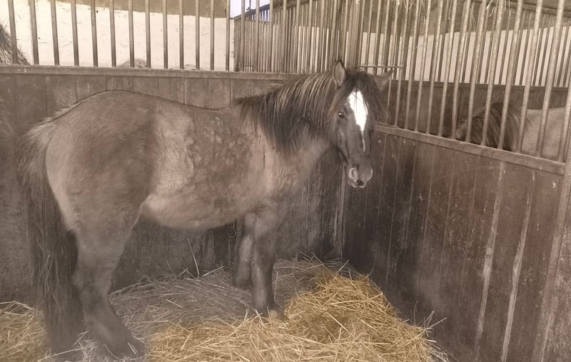 Grisu, a beautiful dark Grullo, is looking for a new owner. Born in May 2024, currently 1.37 m tall, with a powerful build behind and a height of approximately 1.45 m (possibly a bit more) in the Haffiform. Square and well-proportioned, compact, suitable for adult riders in the future. Elegant head, lovely neck crest, very good topline, two-tone mane and tail. His name is Grisu. His mother is a Tinker (1.45 m) crossed with a Konik (147 cm). He is healthy and robust, with excellent hooves. He is used to being turned out alone, remains calm on his own, and is familiar with loading and trailer driving. Very manageable for children and beginners, totally cool and fearless, human-oriented, and learns very quickly. He already knows a lot, including desensitization training, walking in the terrain and on the road. He is gentle when being farriered and comes to call in the herd. There is a possibility that he might be gelded by our veterinarian. Currently, he is housed in a large box with his buddy and is also kept among our mares in the stable. He is a reliable pony suitable for riding and driving. Additionally, he is in one of the most beautiful rare colors, Grullo / Mouse Dun, with zebra stripes on his legs, black-rimmed ears, and a dark dorsal stripe. Photos from foal age included; more recent pictures to follow.