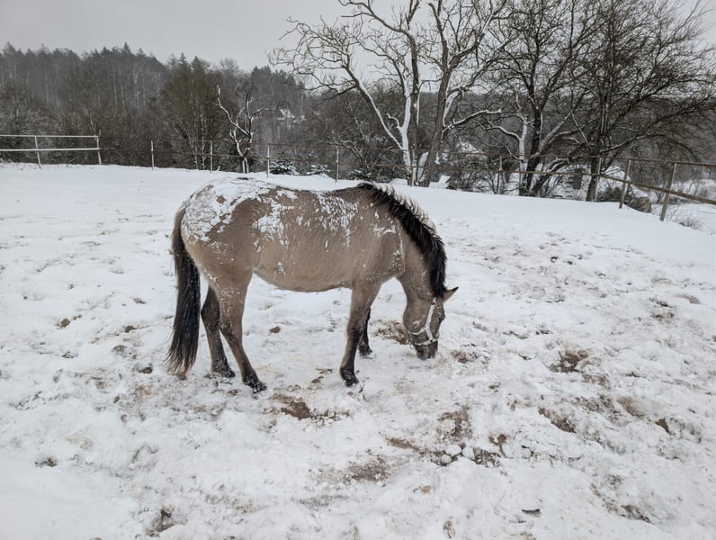 Beautiful, one-of-a-kind Konik filly for sale! This charming silver grullo currently stands at 130 cm, with long legs and an athletic build. She comes from a sport Konik line. Both parents are over 1.45 m. The mare captivates with her friendly, open, and confident nature. She loves cuddles and long walks (she walks easily on her own with her human). Manja is halter trained and knows the first lessons on the ground. She is familiar with farm life and all its noises (tractors, trucks, motorcycles and cars, dogs, cows, alpacas, and much more). She is vaccinated, regularly dewormed, and behaves well at the farrier and in the trailer. Special price for stable boarding (minimum 1 year). Here she remains covered by liability and surgery insurance within the herd. These costs are therefore waived for the first year. If you are interested in this great young mare with lots of potential and would like more information, please do not hesitate to get in touch. I look forward to hearing from you!