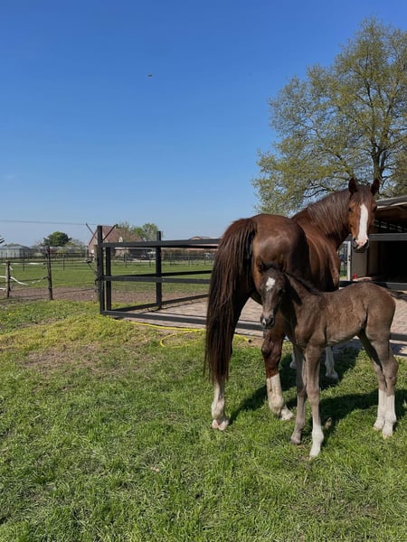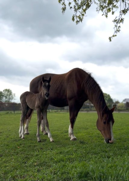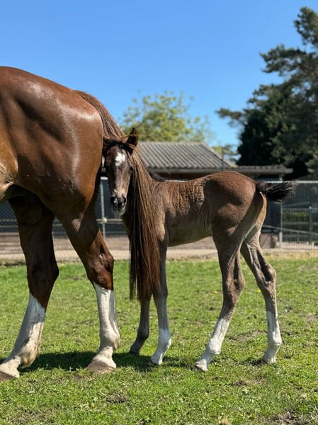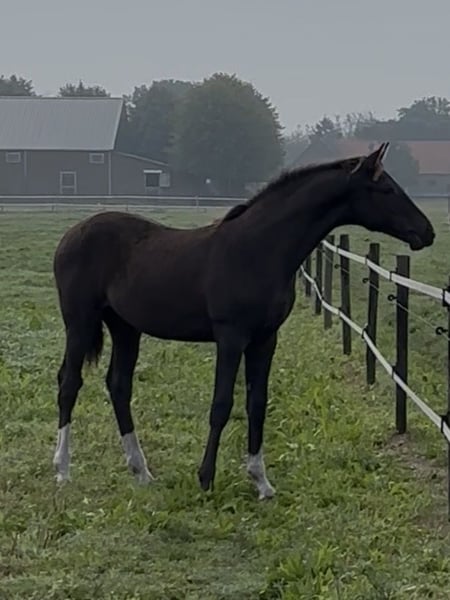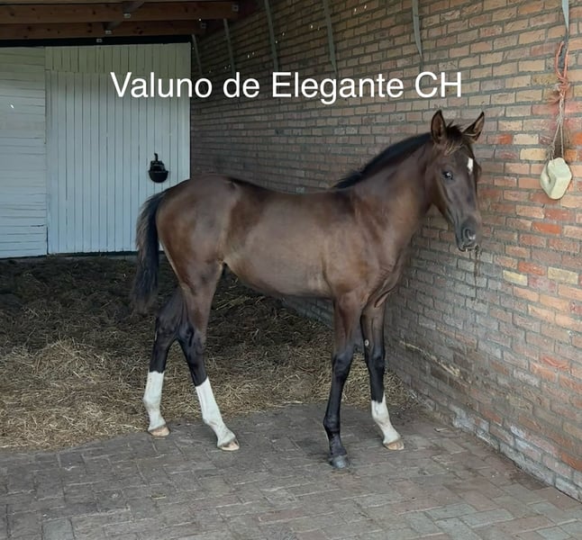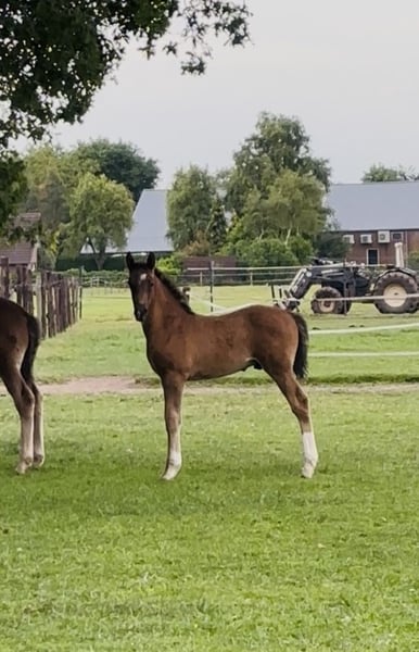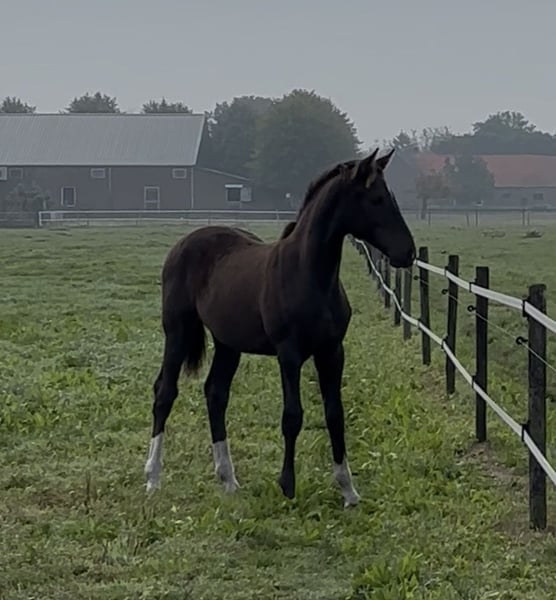 Bent u op zoek naar een veulen met uitstraling, kwaliteit en karakter? Maak dan kennis met ⚜️Valuno de Elegante CH ⚜️– een uitzonderlijk mooi en veelbelovend hengstveulen, ontstaan uit een unieke combinatie van Spaans temperament en Nederlandse dressuurkwaliteit. ⸻ 📍 Afstamming met toekomst • Vader: Elegante de Millan III CH - PRE Apto gekeurd • Moedersvaderlijn: Glock’s Toto Jr. x Ferro • Geboren op: 18-04-2025 • Verwachte stokmaat: ca. 1,70 m + Deze bijzondere combinatie verenigt: • Het vermogen tot verzameling, de expressie en rijbaarheid van de PRE • Met de moderniteit, elasticiteit en werkwilligheid van het KWPN Een pedigree dat wijst op een veelbelovende toekomst in de dressuursport. ⸻ 📍 Opfok met visie & liefdevolle zorg Onze veulens groeien op onder optimale omstandigheden: ✔️ 24/7 weidegang vanaf de geboorte ✔️ Sterke ontwikkeling van botten en pezen door natuurlijke beweging ✔️ Opfok in familieverband (merries en veulens samen) ✔️ Later in een gemengde kudde met paarden van verschillende leeftijden ✔️ Duidelijke sociale hiërarchie voor een evenwichtige opvoeding Het resultaat: Een mentaal stabiel, sociaal vaardig en fysiek sterk jong paard. ⸻ 📍 Vroeg gewend = ontspannen in het dagelijks leven Valuno wordt vanaf het begin gewend aan allerlei omgevingsprikkels: • Tractor • Bladblazer • Paraplu • Bosmaaier • Dagelijkse geluiden Met een ontspannen moeder aan zijn zijde leert hij dat dit allemaal heel normaal is. Reeds vanzelfsprekend voor hem: ✔️ Voetjes geven ✔️ Vaststaan ✔️ Poetsen & overal aangeraakt worden ✔️ Hoefsmid ✔️ Chippen ✔️ Ontwormen Alles verloopt probleemloos. ⸻ 📍 Conclusie Valuno de Elegante CH is niet alleen een echte blikvanger met een edele uitstraling – hij beschikt over de genetische aanleg, de solide opfok en het juiste fundament om: • Te schitteren in de dressuurring • Een betrouwbare partner te worden • Zijn toekomstige eigenaar jarenlang plezier te geven Een veulen met kwaliteit, karakter en potentieel – klaar voor een mooie toekomst. 🐎✨ Bij interesse of voor meer informatie (filmpje) horen wij graag van u.