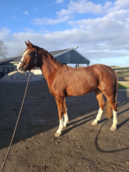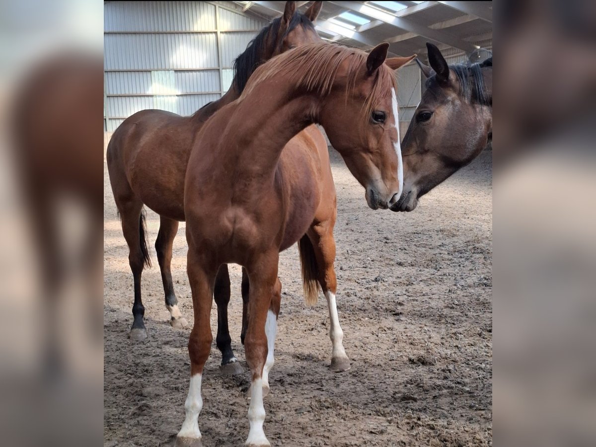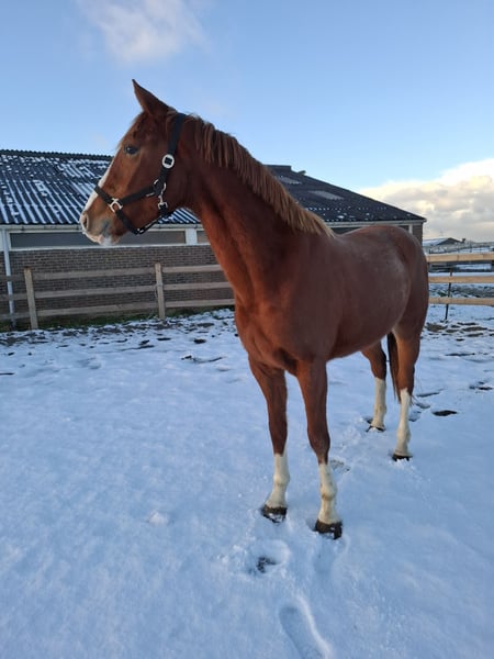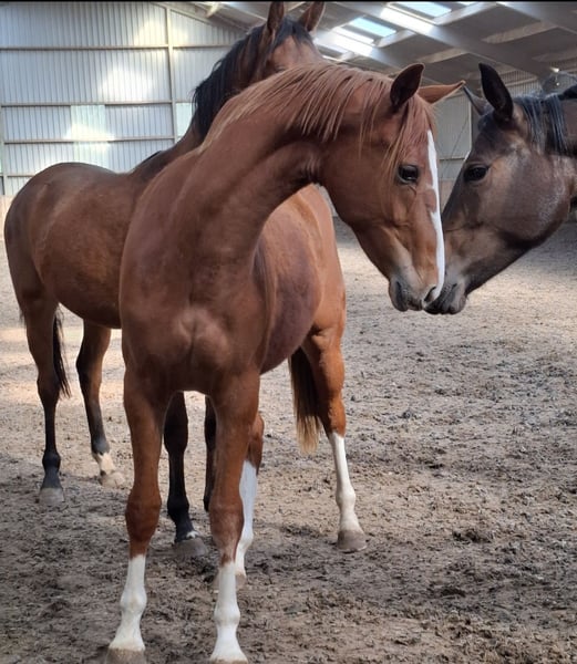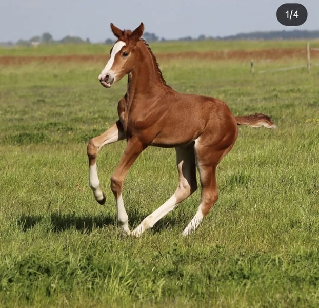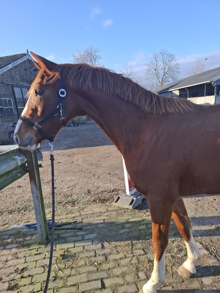 Born in 2023 A true eye-catcher with a beautiful color and four tall white legs. Recently weaned from the mare. Displays three good, correct gaits. Stands correctly on all four legs. No stable or other faults. Expected to reach around 168/170 cm at maturity, currently 164 cm and still overgrown. Sire: Nick Wimphof. Good X-ray results ✔️ Born and raised at home, with all details known. A suitable, caring home is the top priority. Offers are welcome but please keep them realistic. For more information, feel free to send a message or WhatsApp to 0611992494.