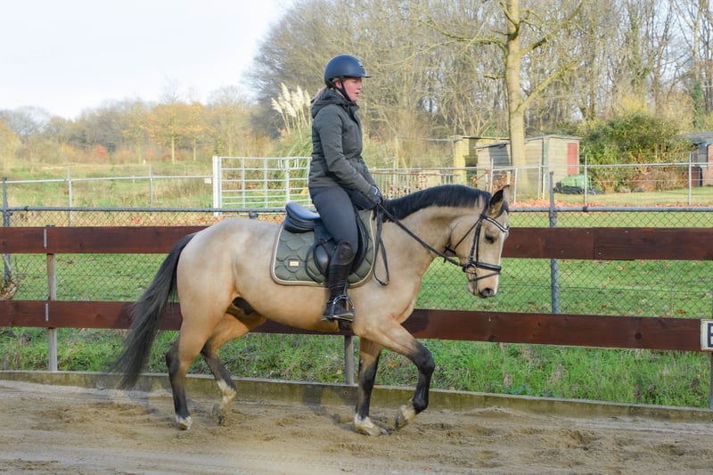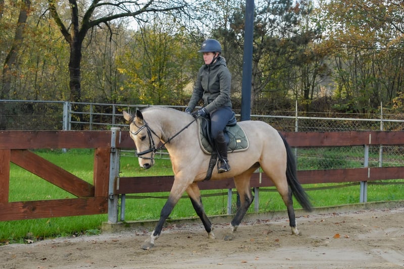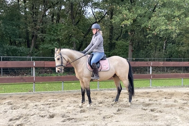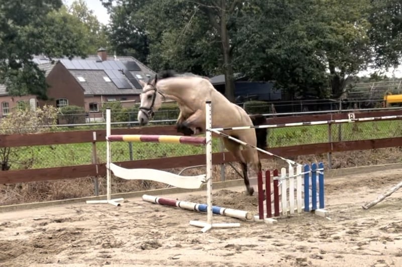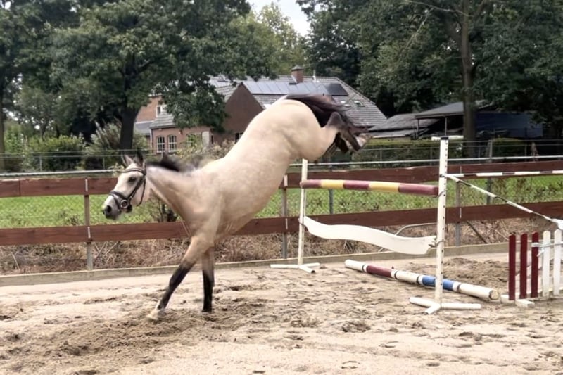 FEI PROSPECT / APPROVED STALLION! ⭐️ Heros is a 3,5 year old D-pony approved stallion / stud for breeding (and also sport), who measures 1.48m. With his beautiful buckskin color, he's a real eye-catcher! He has Zangersheide papers and his pedigree is: Hamlet x No Limit x Joost. His sire is the cremello stallion Hamlet, who is approved by the AES studbook. His dam's sire is the KWPN stallion No Limit, who jumped international at 1.60m level. No Limit has a jumping index of 150 with high reliability, placing him among the top performers. He is also known for his excellent offspring. No Limit is a offspring of the Preferent stallion Indoctro, who became the performance champion as a 3 years old. He also won the IAN Trophy in the 4 years old competition. At the age of 6, he competed in the World Championships for Young Show Jumpers in Lanaken, where he finished 6th. At 8 years old, he was already jumping at the 1.40/1.50m level, winning the Audi Cup and the stallion show jumping competition in Dortmund. Heros's dam line also includes the Holsteiner Preferent stallion Joost, who jumped at 1.50m. As you can see, Heros has a very beautiful and successful bloodline. https://www.horsetelex.nl/horses/pedigree/2630307/heros-by-esclinic-z Heros has incredibly good gaits! In the photos and video, we showed him jumping free for the very first time when he was only 2,5 years old (a year ago), jumping up to 1.20m straight away. He showed a very nice jump with a good back leg technique. We also saw that he really enjoyed jumping! Although he's an incredibly good jumper, we also expect that he will do good in dressage! He's a young, allround pony with plenty of potential. We have high expectations for him! Even though Heros is still young and a stallion, he's incredibly well-behaved and easy to handle! You wouldn't know he's still a stallion at all. He can also stay outside and on the stable next to the mares. He's very sociable with other horses. He knows how to groom/brush, lift legs, use a blanket, use a halter and of course, walk on a lead. We've also done some spook training with him. He'll easily walk past an umbrella, over a tarp, or even a wooden plank! We've now slowly started with making him saddle broken. He knows how to lunge with a bridle and saddle. He has been now under the saddle only a few times. He has also been on a strange arrea and has done his first jump under the saddle. He's doing it all good, but of course, he still has a lot to learn. He knew the trailer and little truck and is quietly on the road. He has no (stable) vices! He has clean X-RAYS for his neck, back, and legs without any remarks! He’s recently approved as an approved stallion by the EU-recognized RBP studbook. We already expect two foals from him next year and the mares where pregnant at the first time trying. A great opportunity for someone looking for a high quality, allround children's and sport/jumping pony or approved stallion for breeding. He's also interested for the international FEI competitions in the future. Of course, it's up to the new owners whether they leave him as a stallion or castrate him. € 11.500