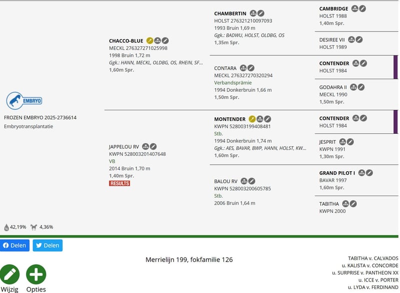 BEVROREN EMBRYO (AVENTEA, ITALIË) Bevroren embryo – Grand Prix genetica (Chacco-Blue × Jappelou RV) Wij bieden een hoogwaardig bevroren embryo aan, afkomstig van de dekking van 's werelds nummer 1 dekhengst met een merrie met een bewezen internationale sportcarrière. ???? Vader: Chacco-Blue – de onbetwiste nummer 1 springhengst ter wereld – vader van talloze 1.60 m / Grand Prix paarden – een garantie voor kracht, bereik en moderne springkwaliteit ???? Moeder: Jappelou RV – een merrie met een internationale sportcarrière tot 1.40 m – bewezen in de sport, correcte bouw, rijdbaarheid – een zeer interessante basis voor verdere sportfokkerij ???? Status: Bevroren embryo ???? Opslag: AVENTEA (Italië) – 's werelds nummer 1 kliniek voor paardenreproductie ???? Technologie: ICSI / ET – de hoogste veterinaire normen ???? Registratie: volledige documentatie, traceerbaarheid (Horsetelex) ???? Profiel: sport + fokkerij (Grand Prix-potentieel) Dit embryo is ideaal voor: professionele sportstallen investeerders in sportpaarden fokprogramma's gericht op het hoogste niveau ???? Prijs op aanvraag ???? Details, documentatie en voorwaarden op aanvraag. Wij bieden volledige ondersteuning bij de selectie van een draagmerrie, het uitvoeren van de implantatieprocedure en het organiseren van het embryotransport naar het gekozen implantatiecentrum. DeSau Stables Sp. z o.o. Premium Sportpaardenfokkerij Polen – België