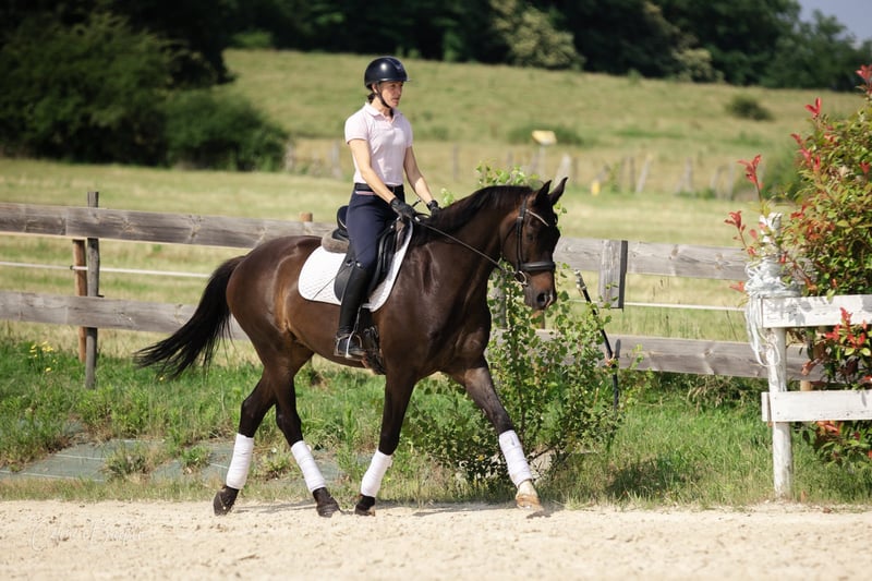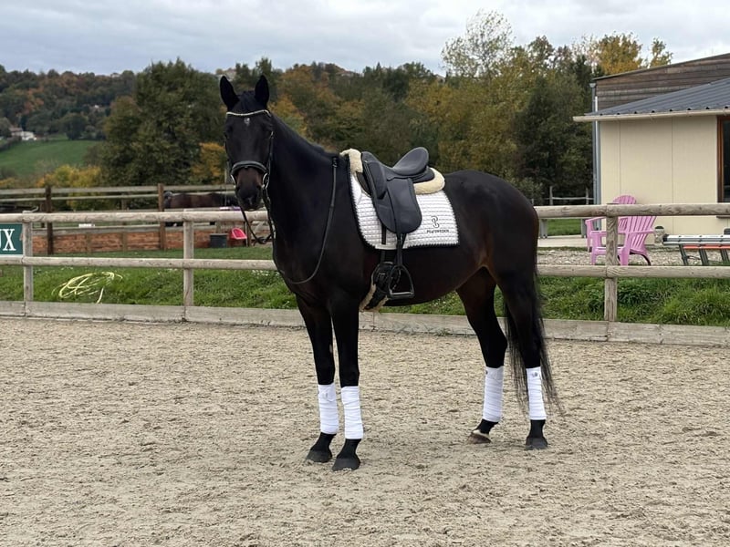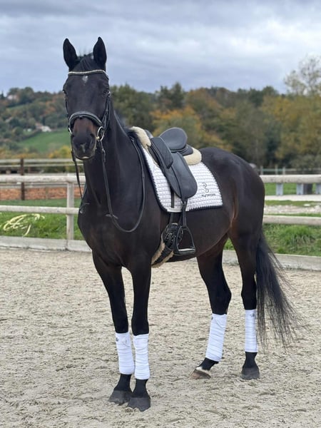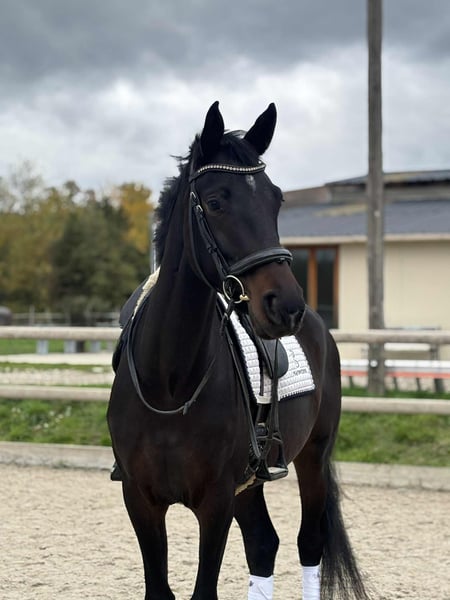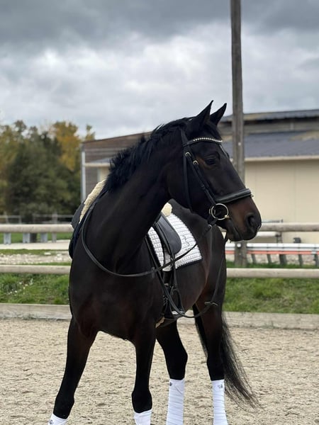 Wunderschöner 10-jähriger KWPN-Hengst mit bezaubernder Persönlichkeit. Kazz überzeugt durch seine Konstanz, sein natürliches Gleichgewicht und seine hochwertige Bewegungsqualität. Sensibles und großzügiges Pferd, zeigt er echtes Engagement im Training und eine starke Motivation, es gut zu machen. Mit einer Größe von ca. 1,67 m vereint Kazz eine ausgewogene Morphologie mit viel Bewegungsumfang, was ihn besonders angenehm im Reiten macht. Er verfügt über einen sehr guten Schritt, weit und elastisch, sowie einen aufstrebenden, aktiven Galopp, der sich ideal für die Entwicklung in den technischen Prüfungen eignet. Sein Trab zeichnet sich durch eine nahezu metronomische Regelmäßigkeit, Elastizität und eine natürliche Impulsivität aus. Kazz wurde bereits in der Amateurklasse 2B vorgestellt, wo er von den Richtern sehr gute Kommentare und Bewertungen bis zu 8 erhielt, was seine Rittigkeit und sein Potenzial unterstreicht. Derzeit arbeitet er auf dem Niveau Saint-Georges, mit kontrollierten Tritten im Trab und Galopp, einem stabilen Gegen-Galopp, festen, sicheren Übergängen sowie bereits gut entwickelten Wechseln in der Luft. Herkunft: Vater: Aqiedo (KWPN), bekannt für die Zucht leistungsstarker, gut gebauter und in der Arbeit zuverlässiger Pferde mit ausgezeichneter Bewegungsqualität. Mutter: Oziena Oes, Tochter des berühmten Jazz (KWPN), einer Ikone der holländischen Zucht, bekannt für Energie, Eleganz und hohe Dressurqualität. Kazz ist ein ausgeglichener, menschenbezogener und respektvoller Hengst. Er kann seine Emotionen selbstständig und mit bemerkenswerter Reife steuern, bleibt aber sensibel und verlangt nach einem ruhigen, ausgeglichenen Reiter, der eine vertrauensvolle Beziehung aufbauen kann. Er eignet sich ideal für einen engagierten Amateur oder einen professionellen Reiter. Pflege und Lebensweise: Seit zwei Jahren in Ausbildung bei einer professionellen Reiterin, profitiert Kazz von einer umfassenden, hochwertigen Betreuung: - Schmied regelmäßig von einem der besten Spezialisten - Regelmäßige Behandlungen durch eine Tierheilpraktikerin, Ernährungsberaterin, Pferdemasseurin, Osteopathin, Bit-Fit-Expertin und Sattel-Fit-Expertin - Gesunder, nie verletzter Pferdekörper mit vorbildlicher veterinärmedizinischer Historie (nur Impfungen) - Leben in der Herde auf der Weide mit Heu rund um die Uhr, für eine gute physische und mentale Balance Vielseitig und motiviert arbeitet Kazz im Dressurtraining, an der Longe, mit langen Zügeln, in Freiarbeit und im Gelände. Er besitzt außerdem eine ausgezeichnete Springanlage, die bisher wenig genutzt wurde, was für einen Reiter interessant sein könnte, der die Disziplinen variieren möchte. Mit seinen soliden Abstammung, seinem hervorragenden Dressurniveau, seiner Vielseitigkeit und seinem liebevollen Temperament ist Kazz ein hochwertiges Pferd, das sich für die Entwicklung in Saint-Georges-Prüfungen und darüber hinaus eignet – und gleichzeitig ein zuverlässiger Partner im Alltag ist. Eine echte Gelegenheit für einen Reiter, der in eine schöne Beziehung investieren möchte, mit einem gut erzogenen, talentierten und sorgfältig betreuten Pferd.