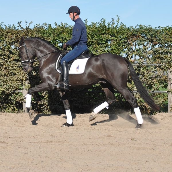 Shadowman is one of our crossbreeding successes and truly amazing, nice, qualitative, trustworthy horse! Super easy and relaxed by hand. Super safe under saddle, also when he wasn’t worked for 3 weeks! Not spooky or nervous. A lot of go, sharp on the leg aids but not scared of the leg. Soft and quiet in the contact but not scared of the bit or hand. Despite we do not ride him a lot, mostly twice a week, he is far ahead of his age! He understands all lateral work already, a flying change mostly as well. What proves his brain, willingness to work and ability to learn are outstanding! Besides this he has a very good walk which does not show under saddle completely jet. He finds to collect way easier as to extend. A trot with a lot of action, of ground and handiness. His canter is sensational! Very uphill, powerful, off ground and big! Bus as easy as he goes very big, he can also collect back! Which is exceptional al this age in our experience... Sire Secret is known as a producer of very nice character and enormous movement! His first crop of offspring represented no less than 25% of the participating 5-year-olds at the WC Young Dressage Horses! And numerous licensed stallions! Mother Modosa is a big, pleasant mare with an enormous will to work and learn. And she still amazes many people how easy a horse can be!