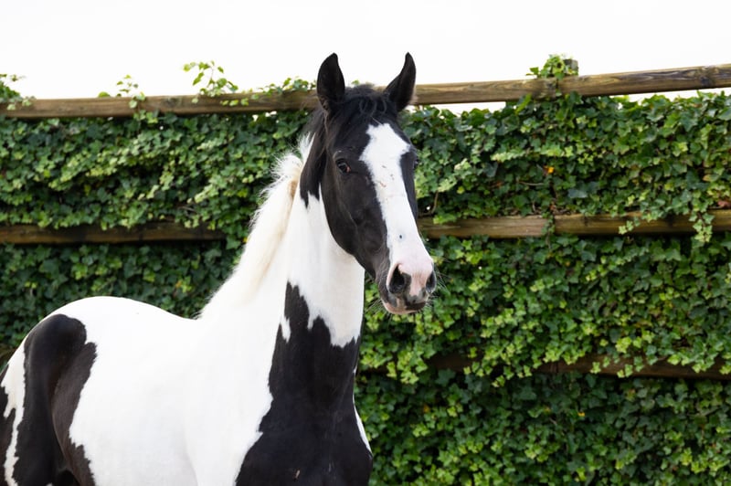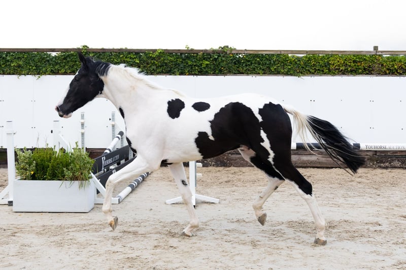 The three-year-old Siebke v.d. Donk R is a beautifully marked pinto with a light-footed way of moving and jumping. In our opinion, she is suitable for multiple disciplines. Her sire is the 8-year-old AES stallion His Pleasure Duborget, half-brother to three 1.50m show jumpers and five 1.40-1.45m jumpers. He is bred from the half-sister of the 1.60m Grand Prix stallions Rahotep de Toscane and Jadis de Toscane. Her dam, Mosegaard’s Franciska, is a pinto mare descending from Favorit ASK (1.45m jumping). She inherited her coloring from her mother, Mosegaard’s Rigolettels (Libero H x Samber).