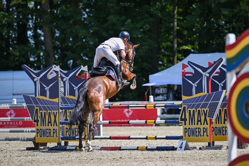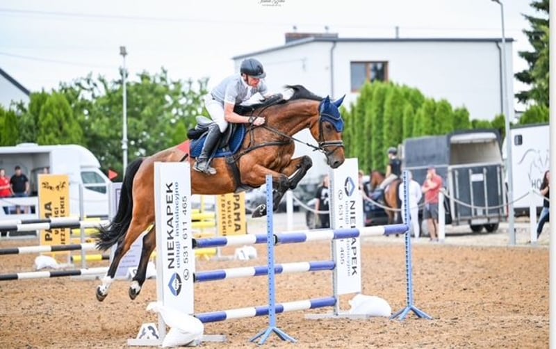 Dobrze zapowiadający się pięcioletni wałach z obustronnym ciekawym skokowym pochodzenie. Od strony matki : Gaillard De La Pomme i Glock^s London, a ojcem wałacha jest: Carrera VDL z całą plejadą skokowych gwiazd. Koń w tym roku rozpoczął stary na poziomie L (100 cm), P (110). Starty udokumentowane. Bardzo elastyczny w skoku. Dobrze galopujący. Zwinny. W obejściu typ " misi" Grzeczny, odważny. bezproblemowy w transporcie, kowalu. Koń padokowany. Bez konfliktowy do innych koni. Bez narowów i wad. Posiada TUV. Bardzo dobre zdjęcia RTG.