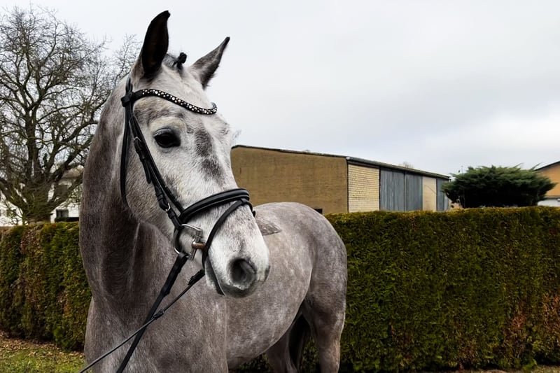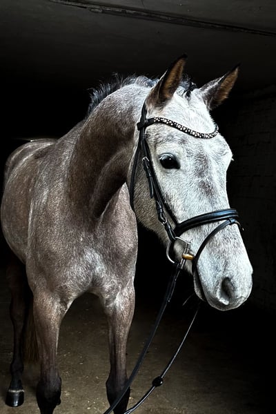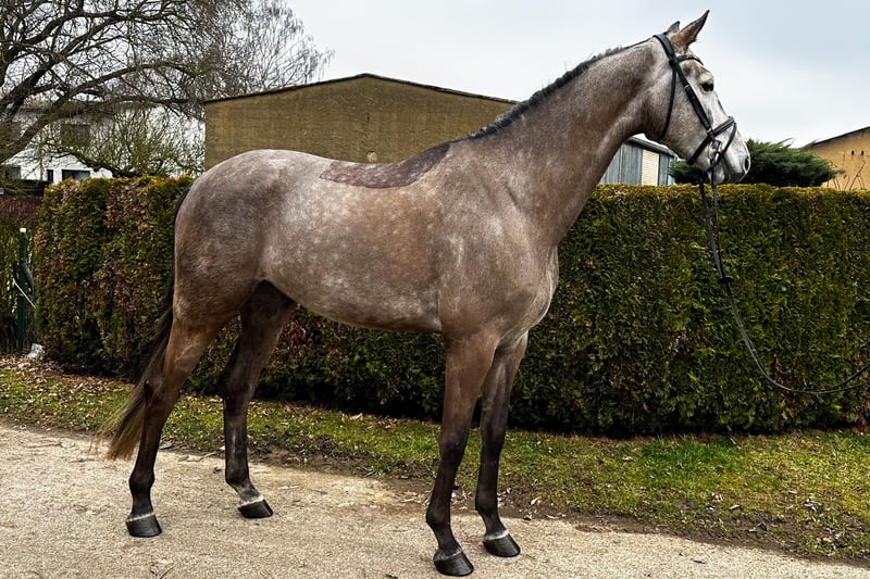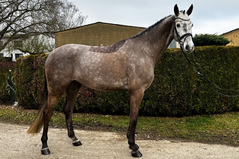 Zum Verkauf steht ein bildschöner, 6-jähriger KWPN-Wallach, der durch seine sportliche Gesamterscheinung und eine erstklassige Abstammung besticht. Mit Hickstead White und Romanov Blue Hors vereint dieser Apfelschimmel feinste Leistungsgenetik und bringt alle Voraussetzungen für eine erfolgreiche Zukunft im Sport mit. Er wurde erst spät angeritten und daher sehr schonend aufgebaut, weshalb er sich aktuell noch am Anfang seiner weiteren Ausbildung befindet. Der Wallach verfügt über drei überdurchschnittliche Grundgangarten mit viel Takt und Elastizität. Im täglichen Umgang sowie unter dem Sattel zeigt er sich stets ehrlich, vorsichtig und dem Menschen gegenüber zugewandt. Er ist absolut frei von Unarten wie Steigen oder Bocken. Als feinfühliges Pferd präsentiert er sich aufmerksam gegenüber seiner Umwelt, bleibt dabei jedoch stets händelbar. Er sucht einen souveränen Reiter, der ihm die nötige Sicherheit gibt, um sein volles Potenzial abzurufen. Seine Doppelveranlagung macht ihn zu einer vielseitigen Offerte für den ambitionierten Reiter. Hervorzuheben ist auch sein Talent am Sprung, das er im Freispringen mit viel Übersicht, schneller Reaktion und Vermögen unter Beweis stellt. Röntgenbilder liegen vor. Dieser charmante Youngster ist eine ideale Gelegenheit für Reiter, die ein qualitätsvolles Nachwuchspferd zur weiteren Ausbildung suchen. Bei Interesse melden Sie sich gerne telefonisch unter: +49 172 69 42 581