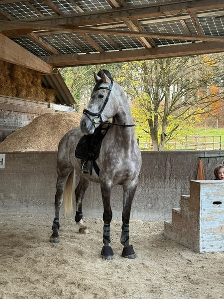 Promise, un promettente stallone KWPN, nato nel 2020. Questo elegante castrone grigio palomino si distingue per la sua impressionante altezza di circa 175 cm e il suo aspetto raffinato. Con la sua struttura moderna e sportiva e un temperamento equilibrato per la sua giovane età, è un partner affidabile per cavalieri ambiziosi alla ricerca di un giovane talento da completare nell’addestramento. Promise è molto volenteroso, intelligente e molto socievole con le persone. Stiamo cercando per lui solo una nuova casa, poiché è ancora all’inizio della sua formazione e mia figlia non è ancora pronta per lui. Promise mostra un passo a trotto con un leggero trotto a galoppo, ma questo non limita il suo lavoro. Il modo migliore per conoscerlo è venire a visitarlo di persona. Sono felice di fornire ulteriori dettagli in caso di interesse.