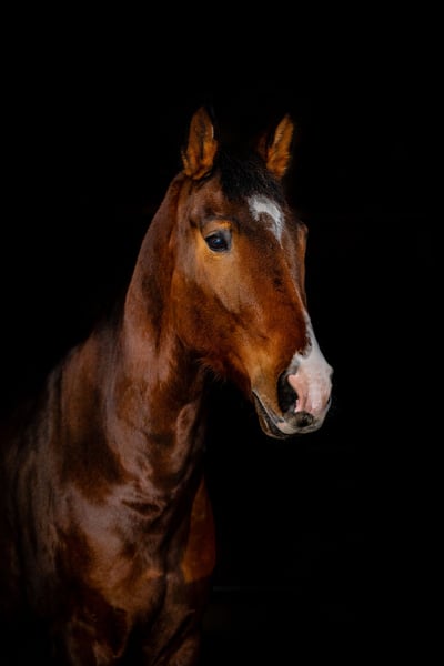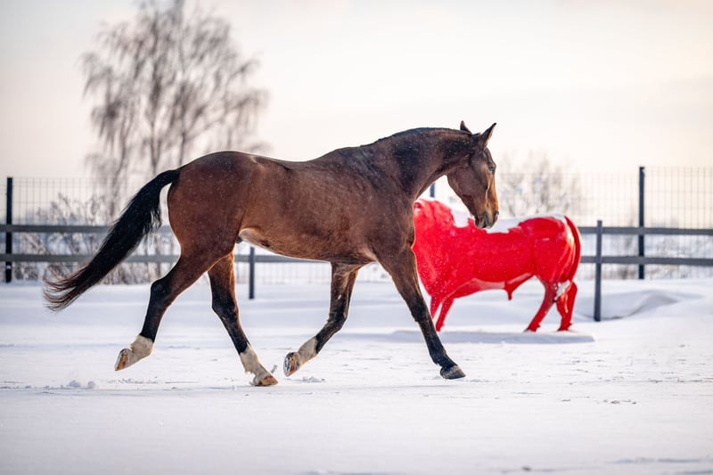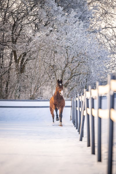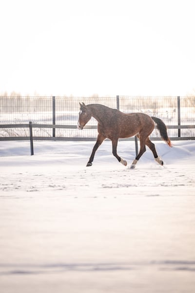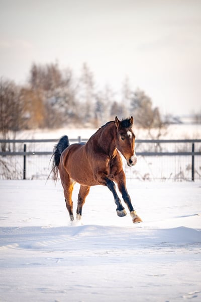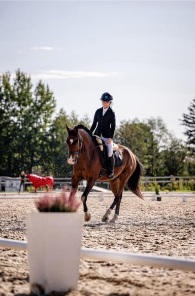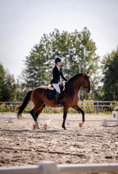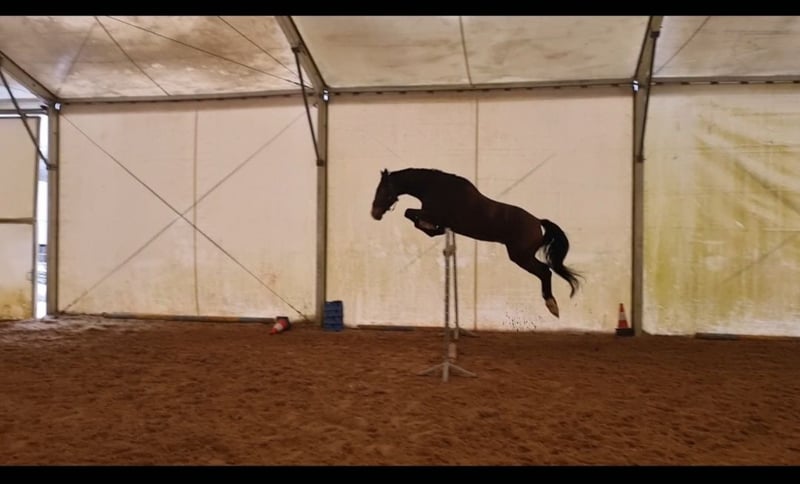Fredi is a lively and joyful horse. He readily interacts with people and participates in training sessions with dedication. He is strong, flexible, and body-conscious, which makes him excellent at jumping. He is a horse that always manages well; he doesn't break away, and if the rider doesn't measure correctly, he helps, and doesn't throw off. At the same time, he is a sensitive and intelligent horse that needs conscious and decisive leadership. He was purchased in 2023, when he was competing in the 100cm show jumping arenas. Initially, he trained in show jumping with his then 11-year-old rider. For the past 1.5 years, they have been training for general development, participating in Working Equitation competitions in the P-class. He has recently returned to more frequent jumping training. For now, to gradually introduce jumping, he is jumping 70-80 cm and easily jumps 130 cm free. He certainly has the potential to do more. He knows yields, half-passes, flying changes, and pirouettes. Healthy, with strong hooves, kept free-range.