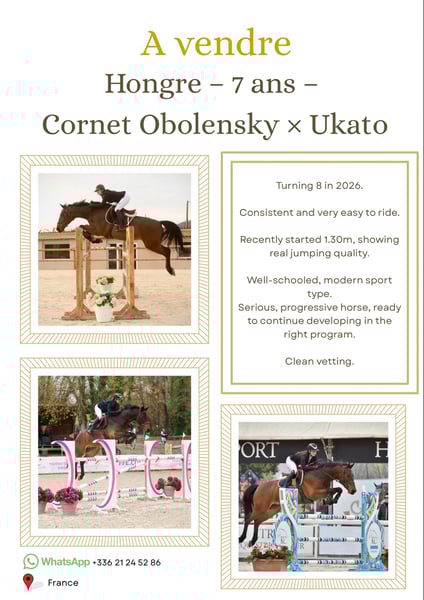 Prend 8 ans en 2026. Cheval régulier et très facile à monter. A débuté les 1m30 récemment, avec une vraie qualité de saut. Très bien dressé, modèle sport. Cheval évolutif, sérieux, prêt à poursuivre sa progression dans une bonne structure. Bonne visite.