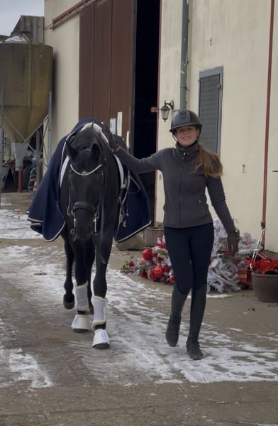 Zum Verkauf steht ein wunderschöner Rappwallach im besten Alter. Als Jungpferd platziert und siegreich in Dressurpferdeprüfungen der Klasse A wurde er ende 5jährig zu uns in den Stall verkauft. Er steht im Eigentum einer sehr netten, aber bereits etwas älteren Kundin, die das Gefühl hat ihm nicht gerecht zu werden, da sie ihn nicht weiter fördern kann. Aus unserer Sicht ist dieser Wallach das perfekte Pferd für Turnier und Freizeitreiter, die Spaß an reiterlicher Entwicklung und Turniersport haben. Er ist sitzbequem, leichtrittig und lernt sehr schnell und einfach. Als klar wurde, dass er demnächst in den Verkauf geht, wurde er von unserer Kundin in Vollberitt gegeben und lernte das L und das L** super schnell und einfach. Gerne stellen wir ihn in diesen Klassen auch noch auf dem Turnier vor. Da er ein großes Talent für Traversalen besitzt, können wir uns vorstellen, dass er für die aktuelle Turniersaison auch das Programm der Klasse M noch schaffen würde, wenn der neue Eigentümer es sich wünschen würde. Für den Verkauf in unseren Stall wurde der Wallach von Praxis Wienand in Bonn komplett getüvt. Der TÜV war OBB Er hat keine unerwünschten Hobbys, wie etwa Weben oder Koppen oder, oder, oder ist natürlich schmiede und verladefromm und kennt alles, was ein Pferd kennen sollte. Er ist KEIN ultimativer Strampler, mit besonders exaltierten Bewegungen, sondern ein losgelassenes, durchlässiges Pferd, das weich an der Hand und damit im Maul ist. Er glänzt und punktet durch seinen klaren, geregelten und räumenden Schritt, einen losgelassenen, fließenden Trab und einen Galopp mit klarem Dreitakt und gutem Durchsprung. Ein Pferd, dass man in jeder Dressurprüfung sehen möchte. Gerne beantworten wir alle Fragen zum Pferd und bieten die Möglichkeit für Probereittermine. Bitte beachtet, das Probereiten kostet bei uns 40,- Euro Gebühr, die gerne beim Kauf verrechnet werden, Termine die über den Reitlehrer, Ausbilder, vereinbart werden, haben keine Gebühr. Wir erheben die Testgebühr NUR zum Schutz vor massivem Reittourismus, der gerade bei „besseren Pferden“ sehr häufig ist und dem Pferd leider schadet.
