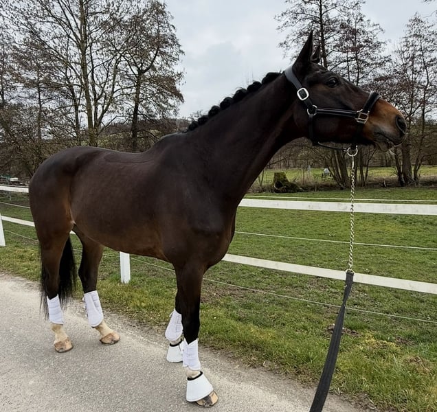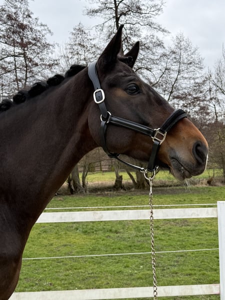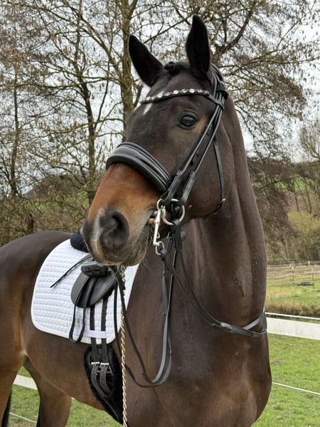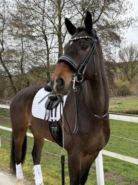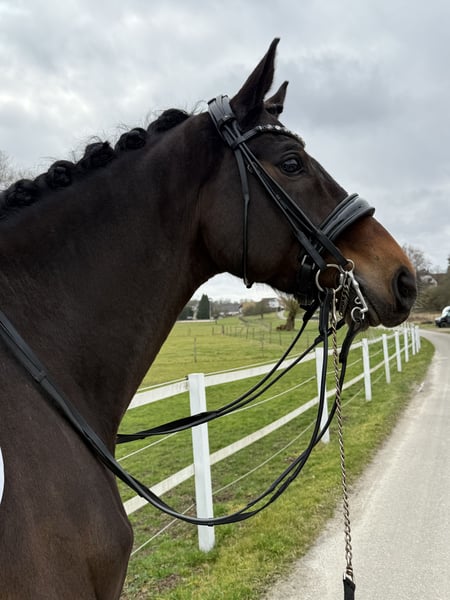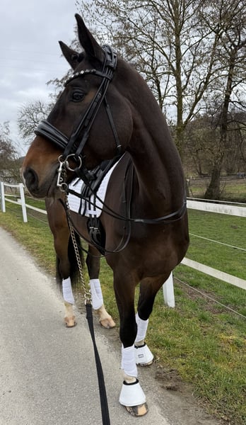 Zum Verkauf steht ein 2017 geborener Wallach der sich bereits 2024 in einer Youngster S* platzieren konnte. Wer einen super süßen Kumpeltyp, mit dem man direkt los reiten kann für M und S* sucht, ist hier genau richtig. Er wurde erst spät 4 jährig angeritten und befand sich dann seit 5 jährig in Profiberitt. Da er die letzten Jahre erst einen Turnierstart hatte, (wo er direkt 3.ter in der Youngster S wurde) liegt er preislich noch im fairen Bereich, da für uns der Fokus darauf lag, ihn daheim mit Liebe und Ruhe auszubilden. Serienwechsel bis 2er sicher, 1er begonnen, Pi und Pa an der Hand begonnen, kleine Sprünge und ausreiten kennt er auch. Er ist angenehm in der Anlehnung und fein am Bein, möchte immer alles richtig machen und gefallen, lernwillig und engagiert, eher sensibel als stark. Absolut für den fein reitenden Amateur geeignet, ideales Pferd um „schön zu reiten“. Alle Lektionen sind ohne viel Aufwand abrufbar. Gut zu sitzen. Immer händelbar- bockt nicht, steigt nicht, rennt nicht los. Im Umgang ist er einfach nur zum verlieben und total süß, er wiehert wenn man kommt und könnte er mit auf die Couch würde er das tun. Er liebt es zu schmusen und seine täglichen Krauleinheiten. Er ist artig beim Schmied und fährt Anhänger sowie auch Transporter. Steht Nachts in der Box und geht täglich den ganzen Tag aufs Winterpaddock. Aufgrund des Alters und des Ausbildungsstandes kein Anfängerpferd. Aktuelle Röntgenbilder gibt es noch keine, können aber natürlich erstellt werden. Ein Video versende ich gerne nach erster Kontaktaufnahme per WhatsApp oder telefonisch 0173-2466817 Wir sehen den Wallach bei jemand der sportlich unterwegs ist für M und S oder auch bei jemand der gerne zu Hause Lektionen reiten/ üben möchte. Familienanschluss bevorzugt :)