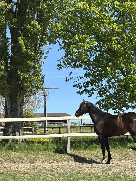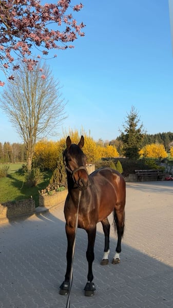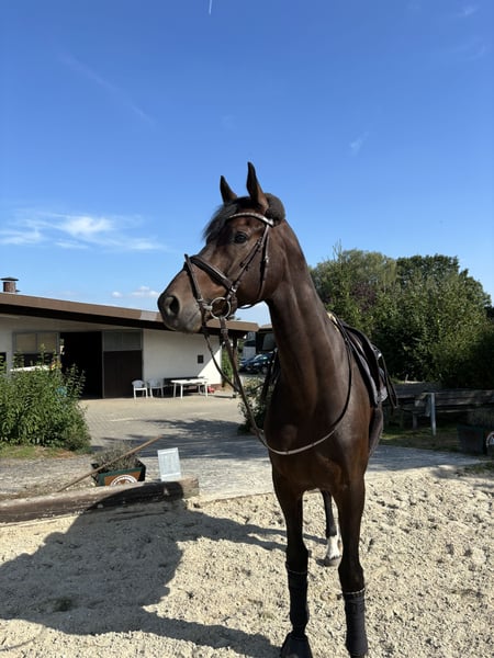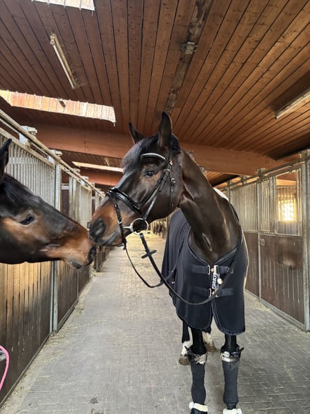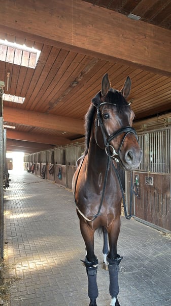 With a heavy heart, I am seeking a new home for my beloved Maskapone. This decision was not easy for me, which makes it all the more important that he finds a caring and forever home where he will be appreciated and well cared for. Maskapone is a 9-year-old gelding standing at 17.5 hands with a very special character. He is an extremely friendly, balanced, and reliable horse in everyday handling. Whether grooming, tacking up, or during daily interactions, he always behaves well, friendly, and uncomplicated. One of his most endearing qualities is his affectionate nature: Maskapone loves human contact and enjoys every bit of attention. He is very attached, actively seeks closeness, and forms a strong bond with his handler. A true heart horse, he impresses not only with his sporting ability but especially with his character. He is trained up to elementary dressage (Class L) and has been introduced to jumping up to Class A. He is motivated, eager to learn, and reliable under saddle. He also makes a pleasant partner in the field and enjoys going out into the countryside. Maskapone is very social and gets along well with other horses. Currently, he is stabled with regular turnout on pasture. It is very important to me that he continues to have daily turnout and social contact with other horses, as this is very beneficial for him. To make his transition as smooth as possible, he will be sold including all his equipment. This includes: - 1 dressage saddle - 1 jumping saddle - Black bridle - Brown bridle - Breastplate - And additional accessories that belong to him All necessary items are included so he can be ridden immediately. Maskapone means a lot to me, and I am therefore only looking for a suitable, responsible new owner who will give him a loving and caring home. If you are interested or have any questions, please feel free to contact me by phone at 0176 4356 7536. I look forward to serious inquiries and to finding the right person for him.