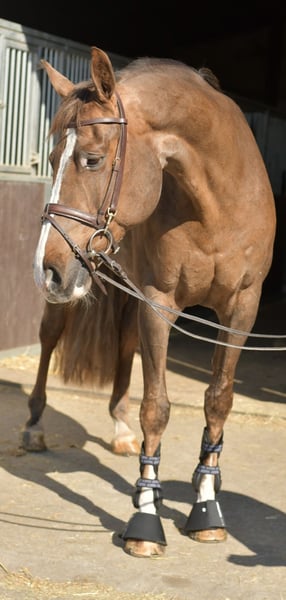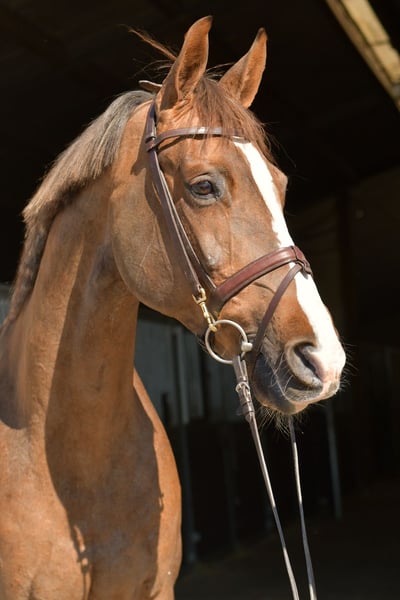 Cheval de saut 1,35 m, placé, prêt à partir en balade