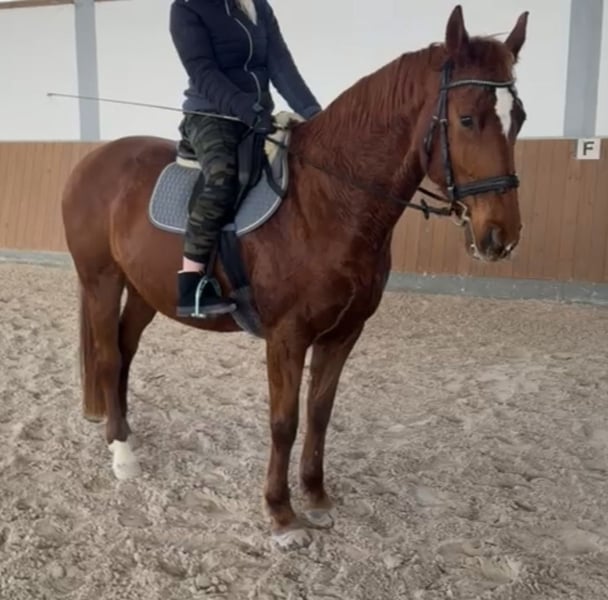 i.A. KWPN 14 jährige Fuchsstute aus Zeitmangel an Bestplatz abzugeben. Absolut Platz vor Preis, am liebsten Endplatz. Ehrliche brave Stute 1,65m groß, unerschrockener unverbrauchter Typ. In den letzten Jahren ausschließlich Freizeit geritten, viel Gelände. Lief als Jungpferd beim Vorbesitzer Turniere bis A Springen. Aktuell wird sie dressurmäsig wieder auf A Niveau angeschoben und zeigt sich hier willig mit Freude an der Arbeit. **** Sie war die Jahre über gesund und hat keinerlei Einschränkungen!***** Ideal für Freizeitreiter, Wiedereinsteiger, ambitionierten Freizeitreiter, Turniere bis A Niveau vorstellbar mit passenden Trainer evtl. auch mehr. Aktuell Barhuf und im Offenstall mit Nachts Box. Abstammung mit NL-Papiere vorhanden: Vater Afellay Mutter Uptown Girl Muttervater Pierrot Probereiten ist nach Terminvereinbarung möglich, einfach melden. Beim Freispringen ist sie sehr motiviert und springt ordentlich. Bei Förderung Potenzial vorhanden!