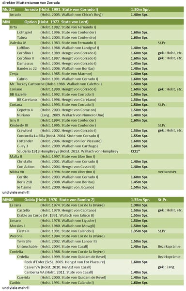 Aufgrund unzuverlässiger Käufer wieder zu haben: Zuchtstute von Chico’s Boy x Corrado I, Holst Stamm 318D2, *2004 Direkter Mutterstamm des Diarado, Corofino I u. II., Coriano, Crawford, Conrad Quality Z, usw. Da wir über Nachzucht verfügen, ist dieses Zuchtjuwel in passende Hände abzugeben. Sie ist auch für den Embryotransfer/OPU-ICSI aufgrund ihrer hervorragenden Abstammung äußerst interessant. Vier Nachkommen bereits im Sport (bis 1.25m). Leider für 2026 leer, da sie verkauft war (siehe oben). https://www.horsetelex.de/horses/pedigree/2039050/zorrada