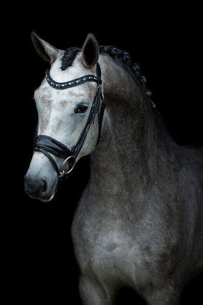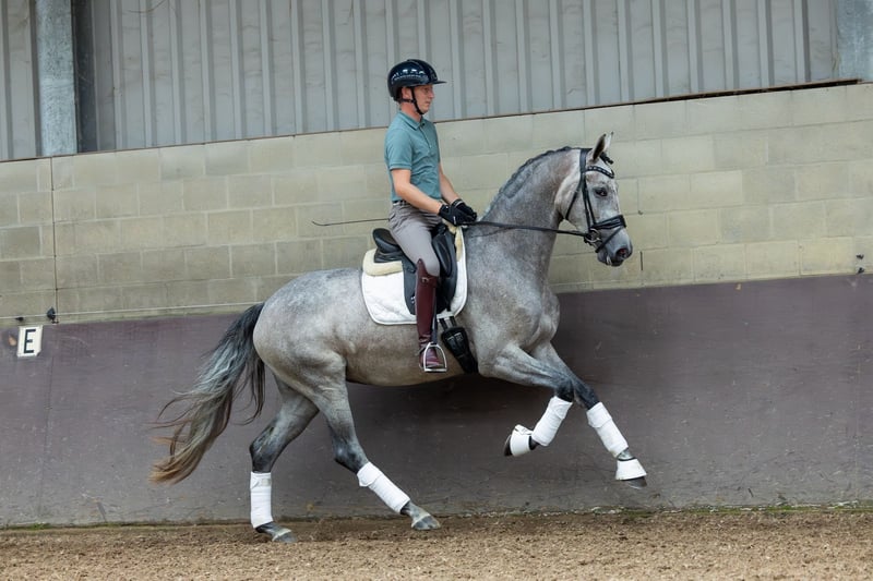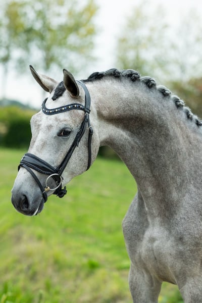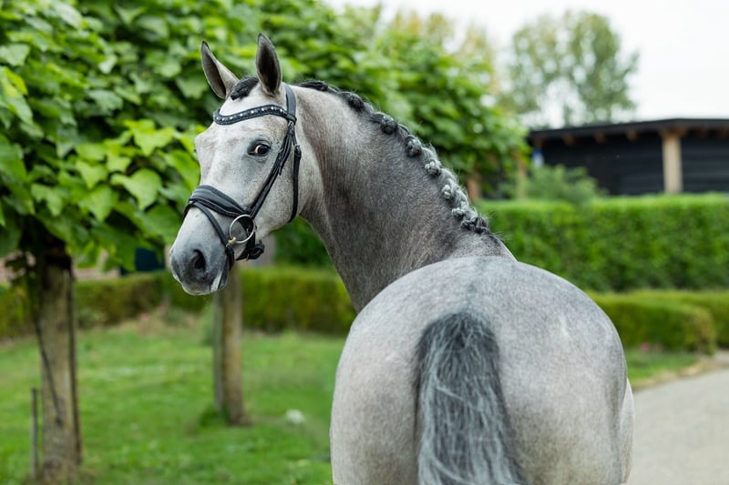 KWPN Verbandsprämienstute, *2021 – ca. 1,70 m Johnny Depp – Bordeaux x Easy Game – Gribaldi Typvolle, blaue Schimmelstute mit bester Perspektive für den Dressursport Diese bezaubernde, bunt gemusterte Schimmelstute ist nicht nur optisch ein echter Hingucker – sie überzeugt auch durch Ausstrahlung, Qualität in der Bewegung und eine vorbildliche Einstellung zum täglichen Training. Nach dem Anreiten im letzten Jahr entwickelt sie sich kontinuierlich weiter und zeigt sich stets rittig, lernwillig und mit positiver Arbeitsestellung. Ihre drei sehr guten Grundgänge, ihr kluger Charakter und ihr angehendes Temperament machen sie zu einem Pferd, mit dem die tägliche Arbeit einfach Freude bereitet. Dabei ist sie stets freundlich im Umgang, klar im Kopf und gut erzogen – auch im Gelände und beim Verladen zeigt sie sich souverän. Ein rundum gelungenes Nachwuchspferd für den ambitionierten Dressurreiter – oder eine Zuchtstute mit viel Format und Vererbungspotenzial. Bitte Melden sie per Whatsapp/ 004366475427490