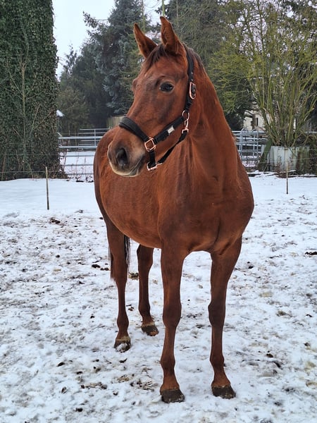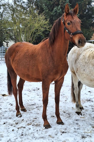 Verkaufe eine elegante KWPN-Stute, geboren im Jahr 2022. Diese wunderschöne Fuchsstute besticht durch ihre ansprechende Erscheinung und ihr vielversprechendes Zuchtpotenzial. Mit einem Stockmaß von 164 cm ist sie eine beeindruckende Erscheinung. Sie stammt aus einer renommierten Zucht und vereint Qualität, Charakter und Vielseitigkeit. Sie ist tragend vom Hengst Fair Deal (v. Franklin-Fürstenball) und muss in 04/2026 fohlen. Sie wird aus zeitlichen Gründen verkauft