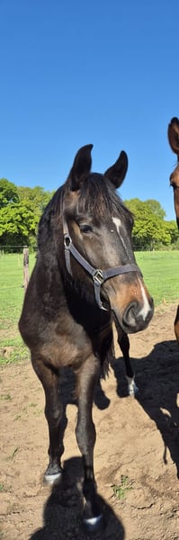 Secret Dream LB is een super lieve en vriendelijke merrie. Ze is 3 jaar en is nog onbeleerd. We hebben haar zelf gefokt. Ze heeft tot 2 jaar in de opfok gestaan en daarna heeft ze bij ons thuis op de wei gelopen met haar maatje. Momenteel gaat Secret elke dag aan de hand mee naar buiten en in de nacht op stal. Moet nog veel leren, maar bij het juiste vertrouwen een heel fijn paard om mee te werken. Absoluut niet gemeen en geen merrie streken. Kent de smid en poetsen. https://www.kwpn.nl/database?paard=P-677392