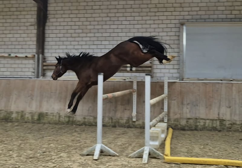 Very beautiful mare by Socrates vd Bosdam (Eras St. Hermelle) x Glennridge. From the same dam, there are already two successful jumping horses up to 1.50 m. Current height approximately 16.9 hh / 17.0 hh. She already jumps a small course and demonstrates a lot of talent. Also very pleasant to ride in dressage. Possesses three above-average gaits. A good veterinary certificate is available.
