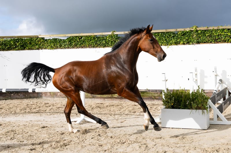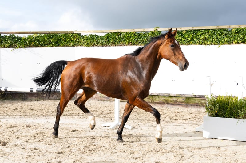 The four-year-old Roxette VE is a well-built mare showing promising caution over fences. Her seven-year-old half-brother Darco VE is now competing in 1.35m show jumping courses. Their sire, Jacquet-Go, was competed by Ruben Romp at an international level up to 1.45m. As a grandson of the 1.50m mare Ginea (dam of the 1.60m Grand Prix horses Whinny Jackson, Ness G Ninea, and Daddycool Go), he comes from an interesting pedigree. The dam, Ecapone, is a daughter of Al Capone (1.60m Grand Prix). She competed in 1.30m show jumping courses, as did her dam, Aminea (by Manhattan out of Iroko x Nimmerdor). Aminea produced four jumpers at 1.20–1.30m level and is half-sister to a 1.35m show jumper and a CCI1* eventing horse. This lineage traces back to the same foundation mare as sire Jacquet-Go.