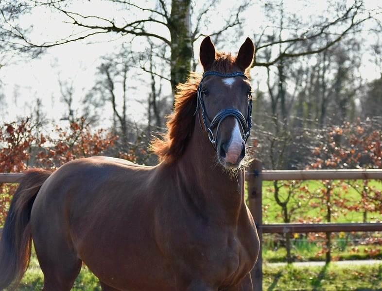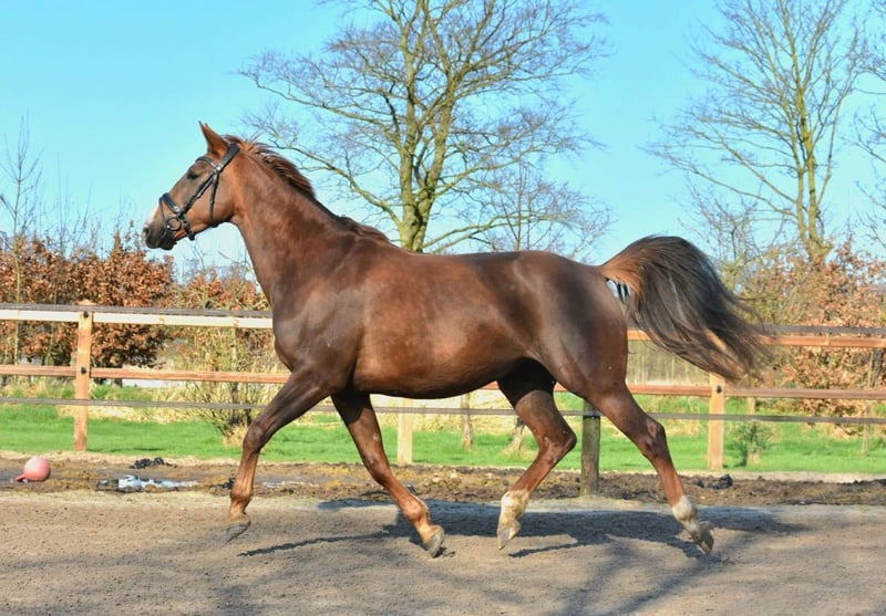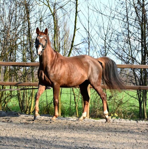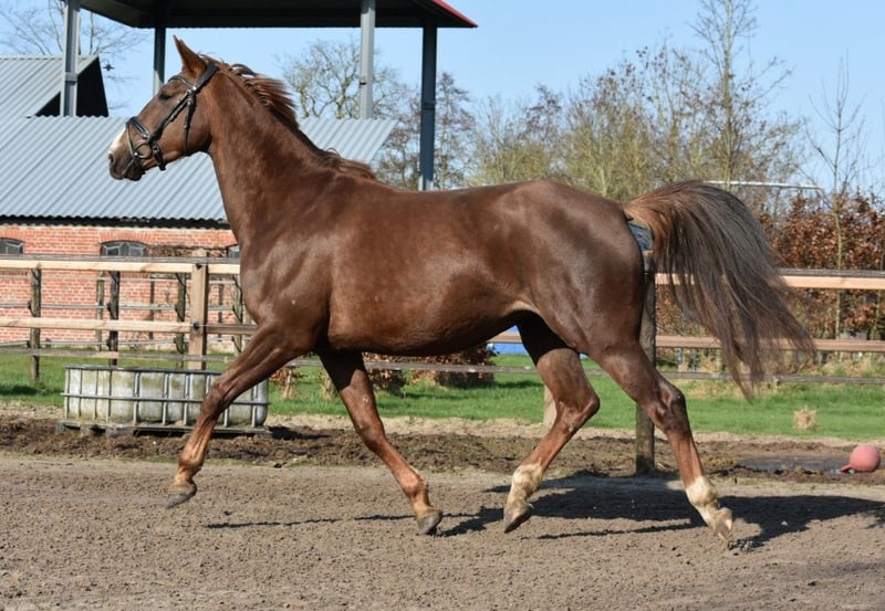 Four-year-old chestnut mare – Cum Laude x Hennessey x Wellington Well-built chestnut mare born in June 2021, with an approximate height of 166 cm. The mare has three correct gaits and is familiar with lunging and basic handling, though she remains somewhat green. Born and raised with us, she has always received calm and proper care. She is naturally sensitive and somewhat mistrustful, which can lead to uncertainty in stressful situations. She is social within her herd, free of stable vices, and holds a passport. She has been vaccinated and dewormed regularly. Inspections are welcome; purchase at the buyer’s expense. Price: €4,750 Viewings in Garyp. For more information: 0610764612