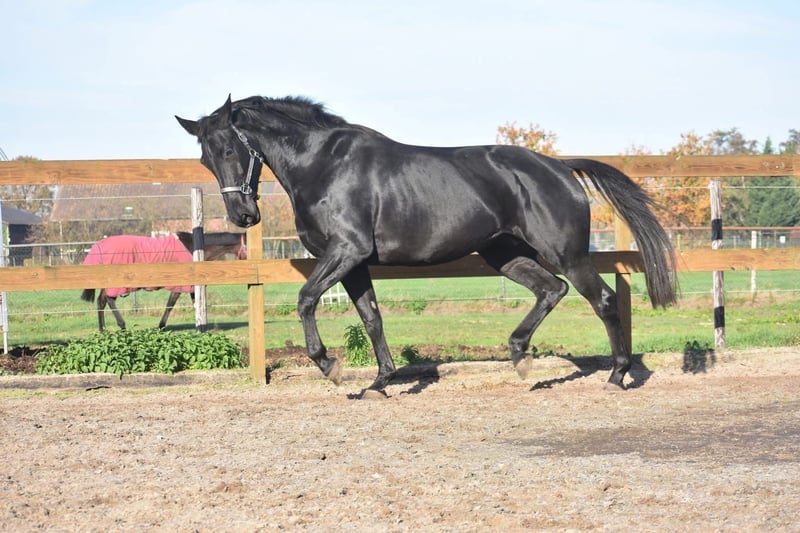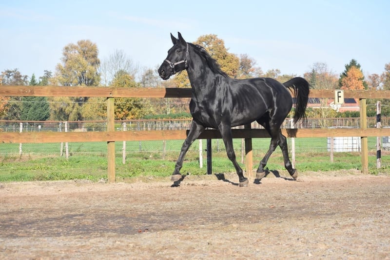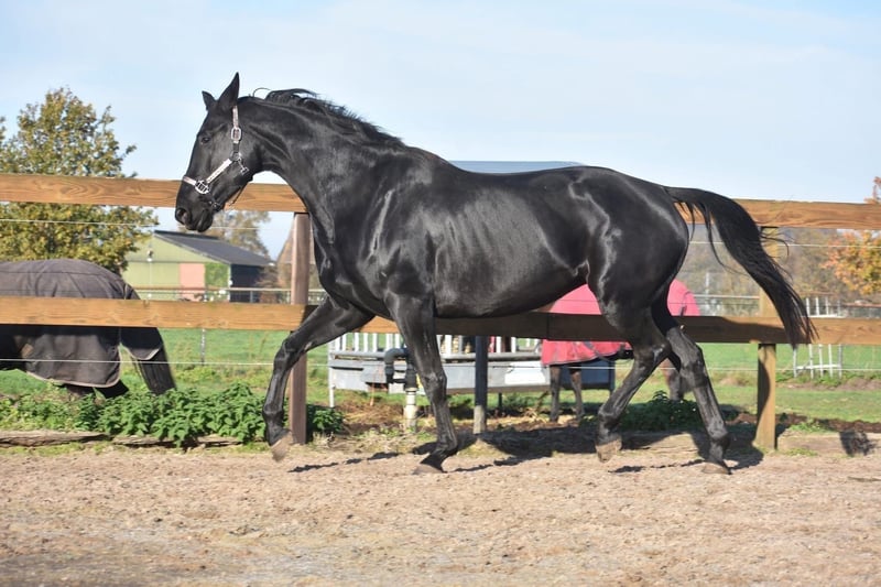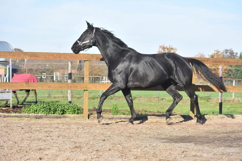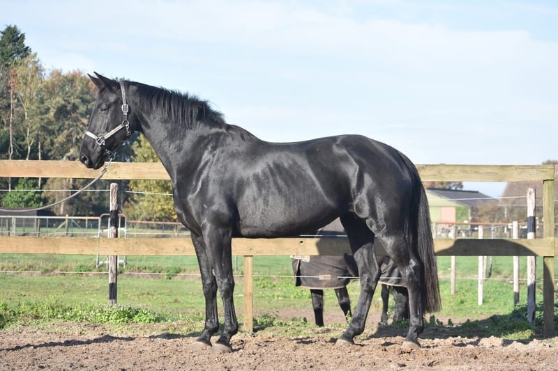 Bloedmooie , gitzwarte , correcte Kjento x Lord Leatherdale merrie Ontmoet Paulina: werkelijk waar een paard uit een sprookje. Met haar diepzwarte vacht en sprekende ogen en mooie , volle bouw is ze een echte verschijning. Paulina is 5 jaar oud, ongeveer 1.72 m hoog en heeft een uitzonderlijke afstamming: Kjento x Lord Leatherdale. Klik HIER voor haar papier . We hebben haar rechtstreeks van de eerste eigenaar overgenomen, waar ze van jongs af aan met veel aandacht is opgegroeid en goed in de hand is geweest. Ze is een echte lieverd met een fijn karakter. Blijft gewoon zonder problemen alleen op stal staan terwijl ze toch heel sociaal is . Paulina is onlangs volledig klinisch en röntgenologisch goedgekeurd, inclusief rugfoto’s. Momenteel zijn we haar training verder aan het oppakken, wat ze met veel talent en inzet doet. Naarmate haar opleiding vordert, zal de prijs meegroeien. Is onlangs door de tandarts behandeld, in bezit van een recent rapport. Prijs: € 9750,- Incl merkzadel en dekje