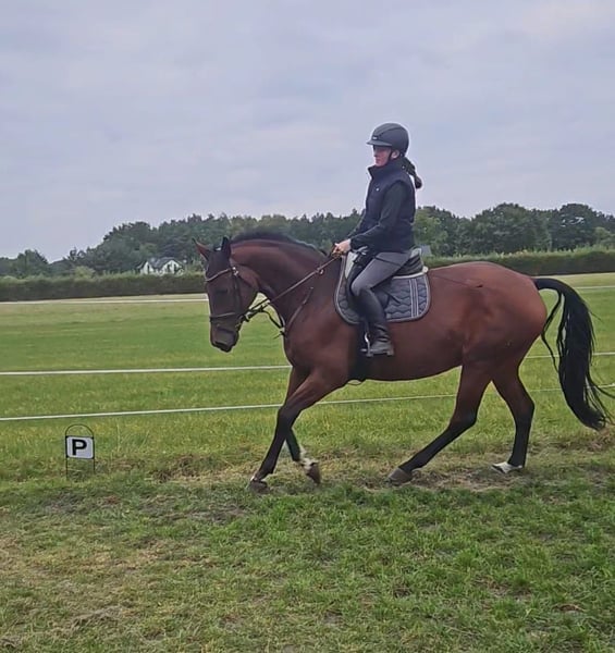 For sale is this 6-year-old KWPN mare "Ominka-Star". She is sired by Pommerol de Muze (Emerald van’t Ruytershof x Kannan) out of a dam by Zapatero VDL x Cantos. She is a very typy mare, standing at approximately 171 cm and has excellent coverage. Ominka had a foal last year and was only started under saddle this year. She moves well in all three basic gaits in the arena and is comfortable both alone and in a group in the field, having already made her first jumps under the rider. She is very easy to ride in contact and has plenty of energy. She is eager to learn and always strives to do everything right. In free jumping, she impresses with great bascule and quick reflexes. Ominka is an absolute gem to handle: her calm, relaxed, and affectionate nature makes her a perfect horse for amateurs! Of course, she is well-behaved for the farrier and loading, is barefoot, has had her teeth done, and has already been X-rayed. Currently, she is in a mixed herd in a paddock, but is also familiar with box stabling. She holds a middle rank within the herd. Now, she is looking for the right home where she can go through thick and thin with her new owner. Please only contact if you are seriously interested; due to the absence of the actual rider, a straightforward transaction is preferred. Trial rides can be arranged at any time, for which a fee of €30 will be charged to protect against riding tourism. For further information, please contact ONLY at 016095972290, no WhatsApp or messages!