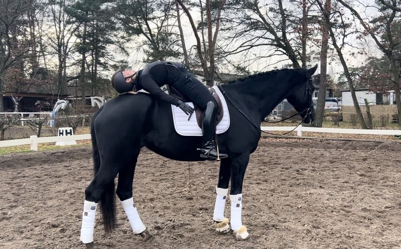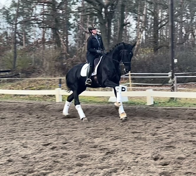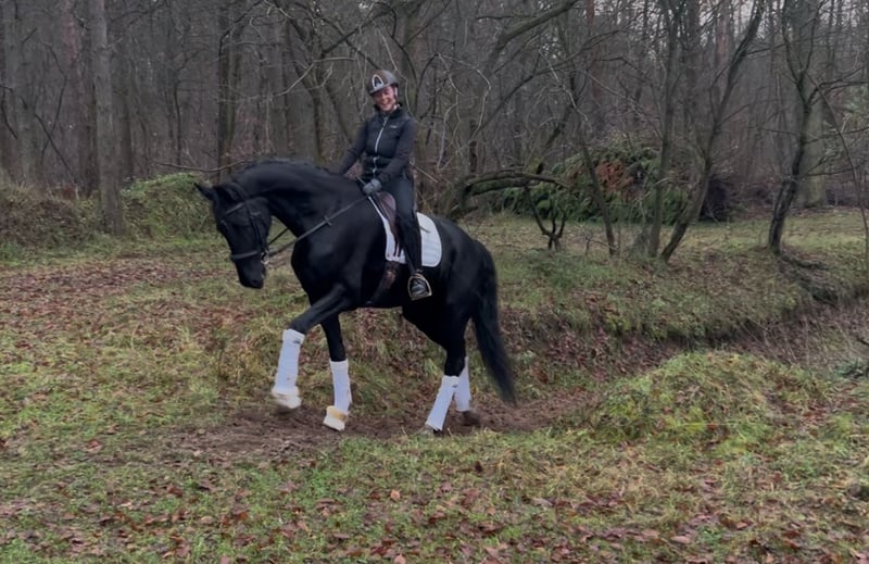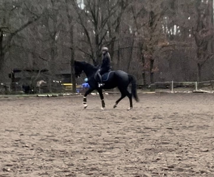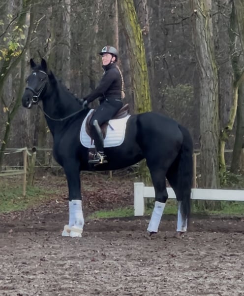 🖤 Expressive, Large-Legged Dream Mare 🖤 ✨ Le Formidable x Apache: Pure charisma combined with top genetics! Approximately 17.5 hh ✨ This stunning, imposing mare turns heads wherever she goes and is pleasantly responsive to aids, working motivatedly in training. Besides her three excellent basic gaits, she has an exceptionally solid foundation, making her a talented, long-legged dressage horse. She can be ridden beautifully without spurs or whip and is accustomed to trail rides in the countryside and forest. X-rays (including back and neck) and a recent veterinary check (small AKU) are available ☑️ The mare is very easygoing and is kept in a mixed herd. Her teeth have been recently floated following a minor AKU (overlooked because soft in the mouth). The mare may also be suitable for vaulting or para-equestrian sports, as she is very insensitive to movement and touch, and remains completely relaxed during "turn exercises." She has already been introduced to competition and even participated in the well-known Pavo Cup (semi-finals). She performed mainly in a calm and expressive manner. She has been trained gently so far. Due to her size and long legs, she still needs a bit more time and strength to fully develop and showcase her potential in sport. Secure this special gem quickly as a “complete package,” because this enchanting mare will make someone very happy in no time. Private sale (investment), please contact the trainer directly (she has a baby and is reachable in the evenings) – she has been commissioned to handle the sale of the horse. 📞 0176 41846151 📞 ▶️ To prevent riding tourism in the best interest of the horse, €30 should be handed to the trainer voluntarily before the trial ride. This amount will be deducted from the purchase price, of course.