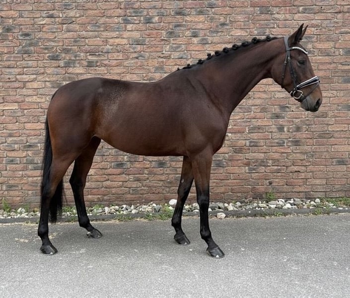 Genius and madness at the same time… Very elastic mare with 3 great basic gaits and a lot of expression! The art with this horse lies in keeping her supple. She is pleasant to the leg and also in the hand, but is environmentally oriented. One can quickly find oneself in a situation where she lifts herself and then freezes. In the walk, one can always let go, and she strides with a long neck, even at competitions. Lateral movements come easily to her. She is M level safe and has been placed multiple times. S-level exercises as well as talent for piaffe and passage are present, but not yet firmly established. She is familiar with pole work and can be ridden both alone and in a group in the field. She is very well-behaved in handling. Current X-rays are available!