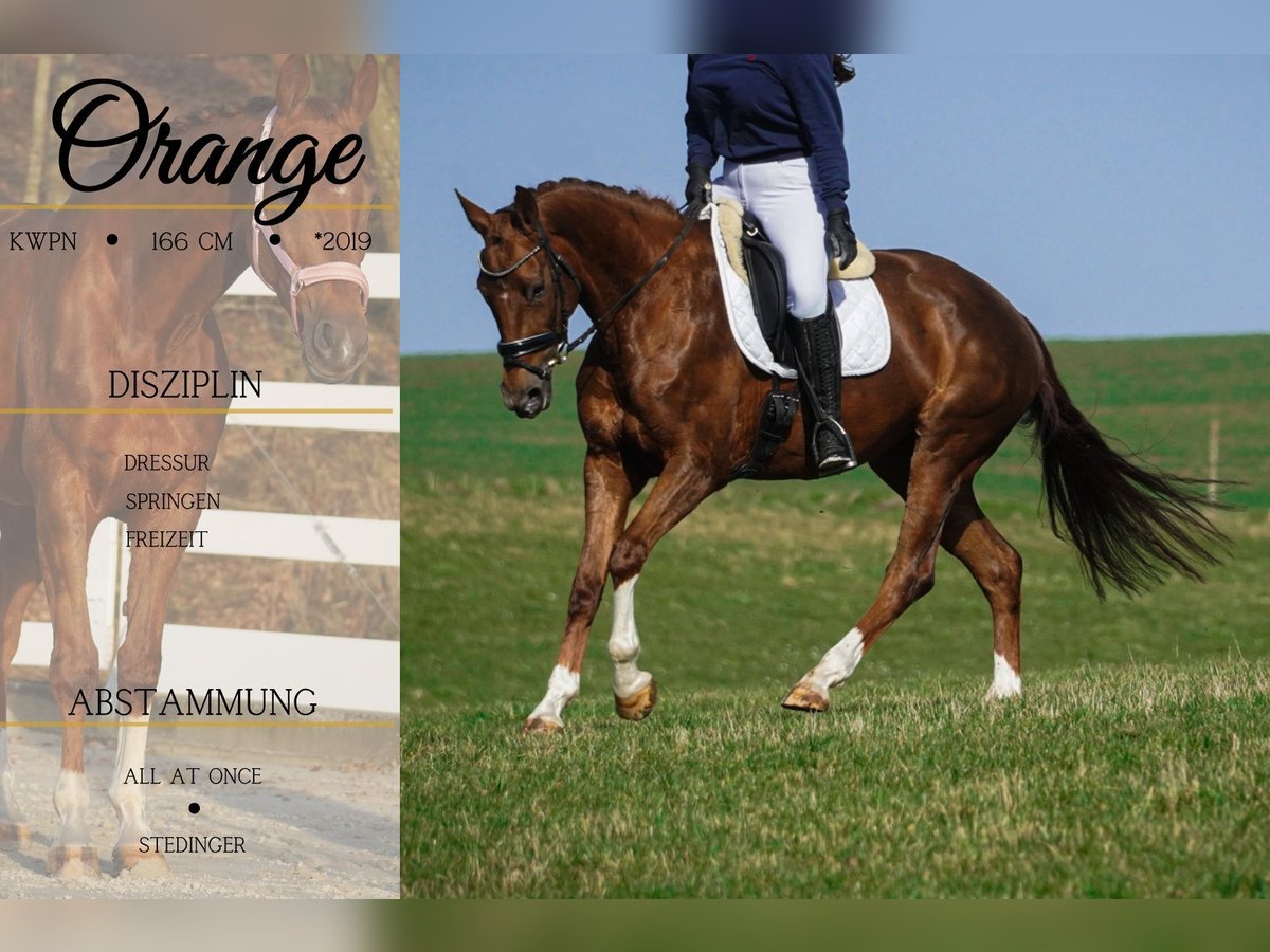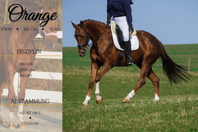 Orange Queen is a stunning, fully rideable 7-year-old KWPN mare, approximately 16.1 hh, by All at Once, Ampere, Gribaldi x Stedinger, Sandro Hit, Cavalier. *Orange Queen* is a beautiful, well-trained, and confident mare. She is ideal as a school horse. Placed in competitions and experienced. She moves effortlessly in a soft contact and is not sensitive or hot at the aids. She is comfortable to sit and provides a very secure feeling. She is well-behaved in the terrain and also in traffic. She makes a nice jump and enjoys pole work as well. !!! BE SURE TO WATCH HER VIDEO !!! She is also a sweetheart in handling. Affectionate and well-mannered, not spooky. She already has a current veterinary health certificate (AKU). A recent video can be found in the listing or at the following link: https://www.youtube.com/watch?v=SdnWTBh-gzM Horse dealership Dederichs – Your partner for horse buying Contact & Availability: Inquiries please exclusively by phone at 0173/9792139 Monday – Friday: 09:00 AM – 6:00 PM Saturday: 09:00 AM – 3:00 PM Sunday: Closed Follow us on social media! Experience our daily work with the sale horses on Instagram, TikTok & Facebook under Pferdehandlung Dederichs Discount: Receive 5%–10% off if you take your new dream horse immediately Trial riding & demonstrations: • Trial ride: €40 per horse (up to 2 riders), amount credited upon purchase • Holidays: Trial ride €50 • Demonstration by our trainers: €30 per horse (pre-riding, ground work, etc.) Pre-purchase examination & transport: • Many of our horses already have a current AKU • You are, of course, welcome to bring your own veterinarian • We can organize an examination for you • We also gladly assist with transport to your new home Other horses for sale: We have additional horses for sale in our stable that are not yet listed online. If your dream horse is not yet among them, do not hesitate to contact us. Important notes: • Height information is approximate and not precisely measured • All descriptions are subjective assessments by the seller and do not constitute guaranteed properties