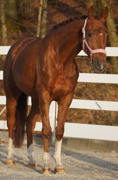 Orange Queen to 7-letnia klacz rasy KWPN, około 1,67 m w kłębie, po All at Once, Ampere, Gribaldi x Stedinger, Sandro Hit, Cavalier. *Orange Queen* to przepiękna, w pełni nadająca się do jazdy i bardzo spokojna klacz. Doskonale sprawdzi się jako koń szkoleniowy. Jest startowa i doświadczona na zawodach. Lekko przechodzi w uzębienie i nie jest wrażliwa ani nerwowa na pomocki. Jest wygodna w siodle i daje poczucie dużego bezpieczeństwa. Spokojnie chodzi w terenie oraz w ruchu ulicznym. Pokazuje ładny skok, a praca z przeszkodami sprawia jej przyjemność. !!! KONIECZNIE OBEJRZYJ JEJ FILM !!! W pracy z człowiekiem jest również skarbem. Przyjazna, dobrze wychowana, nie stękająca. Aktualne badanie AKU ma już za sobą. Aktualny film znajdziesz tutaj w ogłoszeniu lub pod linkiem: https://www.youtube.com/watch?v=SdnWTBh-gzM Hodowla koni Dederichs – Twój partner w zakupie konia Kontakt i dostępność: Zapytania prosimy kierować wyłącznie telefonicznie pod numer 0173/9792139 Poniedziałek – piątek: 09:00 – 18:00 Sobota: 09:00 – 15:00 Niedziela: dzień wolny Śledź nas w mediach społecznościowych! Poznaj naszą codzienność z końmi na Instagramie, TikToku i Facebooku pod nazwą Pferdehandlung Dederichs Rabat: Przy natychmiastowym odbiorze nowego wymarzonego konia otrzymujesz rabat od 5 % do 10 % Próba jazdy i prezentacja: • Próba jazdy: 40 € za konia (max. 2 jeźdźców), kwota zostanie odliczona od ceny zakupu • Święta: próba jazdy 50 € • Prezentacja przez naszych jeźdźców: 30 € za konia (przygotowanie, praca na ziemi itp.) Badanie przedzakupowe i transport: • Wiele naszych koni ma już aktualne badanie AKU • Oczywiście możesz zabrać własnego weterynarza • Chętnie zorganizujemy badanie • Chętnie pomożemy również w transporcie do nowego domu Więcej koni na sprzedaż: W naszym stajennym asortymencie znajdują się także inne konie na sprzedaż, które jeszcze nie są dostępne online. Jeśli Twoje wymarzone konie jeszcze nie ma w ofercie, nie wahaj się z nami skontaktować. Ważne informacje: • Szacunkowe wzrosty są podane orientacyjnie i nie zostały dokładnie zmierzone • Wszystkie opisy są subiektywnymi ocenami sprzedającego i nie stanowią gwarancji cech konia