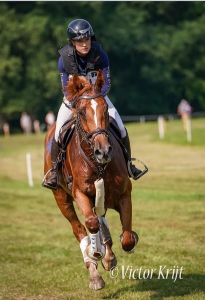 The perfect junior horse! Unfortunately, due to having to make some difficult choices, we are offering our sweetest mare for sale. Olivianne is a 6-year-old mare by Gemini XX x Zapatero VDL. We have trained her ourselves since she was 4, and we can say with certainty that she is the kindest horse ever. She is incredibly honest, always willing to work, very level-headed, and suitable for any rider. She always puts a smile on your face—she’s simply a joy to ride! Olivianne is competing at M1 dressage, 1.20m showjumping, and recently 2 eventing*. In the 1* she has been placed almost every time. She consistently scores 66%–72% in dressage, and she is very brave in the cross-country phase. You can ride her in all disciplines with a simple bit, without spurs; she is responsive to the leg and not spooky at all. She will always take her rider safely to the other side! She is also very suitable for the transition from pony to horse. She shows no “mare behaviour” whatsoever and is very social with both people and other horses. She recently passed a full vetting, including back and neck X-rays, and we have also recently had her tendons fully scanned—everything was completely clean. She is well-behaved for the farrier and vet, loads easily on both trailer and truck, and has no stable vices. A horse that will bring you an enormous amount of joy! For videos and more information, please send a WhatsApp message or call + 31 (0)6-13742234. Price indication: 55k+