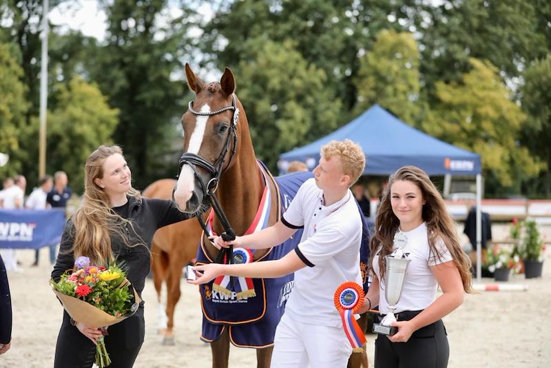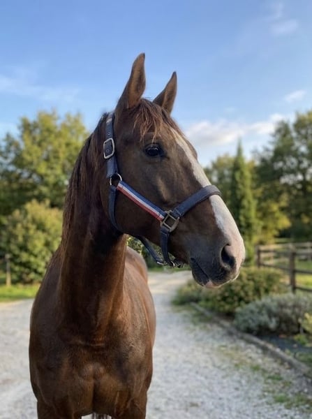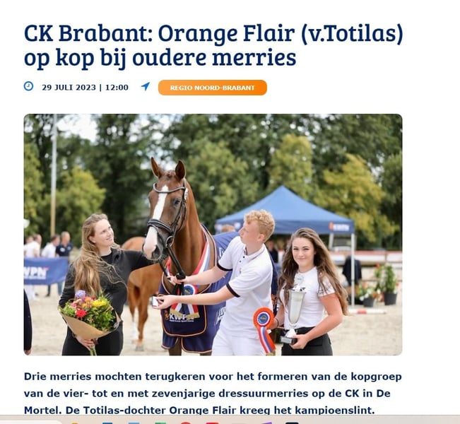 Orange Flair is een prachtige merrie, afkomstig uit de combinatie Totilas x Florencio x Krack C. Ze heeft een harmonieus model met veel formaat en beschikt over drie mooie, luchtige gangen. Ze werd op 3-jarige leeftijd Kampioen in de zuidelijke regio tijdens de KWPN-merriekeuring in Nederland. Ze is zeer prettig in de omgang en erg zacht in de verzorging. Ze kent de stapmolen en gaat elke dag naar de paddock. Ze is op 3-jarige leeftijd ingereden maar heeft weinig gewerkt, waardoor ze nog vrij groen is. Ze kent echter al schouderbinnenwaarts, appuyementen en travers in stap en draf. In galop beheerst ze stap-galop en galop-stap overgangen. Momenteel werken we aan het contra-galop. Ze gaat zowel alleen als in gezelschap op buitenrit. Een veelbelovende merrie voor iemand die de tijd wil nemen om haar correct op te leiden. Orange Flair is a stunning mare from the combination Totilas x Florencio x Krack C. She has a harmonious conformation with good height and three lovely, airy gaits. At 3 years old, she was Champion in the southern region during the KWPN mare classification in the Netherlands. She is very pleasant to handle and extremely gentle in her daily care. She is familiar with the walker and goes to the paddock every day. She was started under saddle as a 3-year-old but did very little work during her first years, so she is still quite green. However, she already knows shoulder-in, leg yields, and haunches-in at walk and trot. In canter, she can perform walk–canter and canter–walk transitions, and we are currently working on counter-canter. She hacks out both alone and in company. A promising mare for someone willing to take the time to develop her correctly. Orange Flair est une magnifique jument issue de l'accouplement entre Totilas x Florencio x Krack C. Elle a un modèle harmonieux avec de la taille et possède 3 jolies allures aériennes. Elle a été Championne à 3 ans dans la région sud lors du classement des juments KWPN en Hollande. Elle est très agréable à manipuler et très douce aux soins. Elle connaît le marcheur et va tous les jours au paddock. Elle a été débourrée à l’âge de trois ans, mais a très peu travaillé durant ses premières années, ce qui fait qu’elle est encore assez verte. Cependant, elle connaît déjà l’épaule en dedans, les cessions à la jambe et le travers au pas et au trot. Au galop, elle sait faire les pas-galop/galop-pas. Nous travaillons actuellement sur le contre galop. Elle part en balade seule ou accompagnée. Une jument prometteuse pour qui saura prendre le temps de la former. Orange Flair ist eine wunderschöne Stute aus der Anpaarung Totilas x Florencio x Krack C. Sie hat ein harmonisches Exterieur mit viel Größe und verfügt über drei schöne, leichtfüßige Grundgangarten. Mit 3 Jahren wurde sie Champion in der südlichen Region bei der KWPN-Stuteneintragung in den Niederlanden. Sie ist sehr angenehm im Umgang und ausgesprochen sanft in der Pflege. Sie kennt die Führanlage und geht täglich auf die Weide/Paddock. Sie wurde im Alter von drei Jahren angeritten, hat in den ersten Jahren jedoch nur wenig gearbeitet, weshalb sie noch recht grün ist. Dennoch beherrscht sie bereits Schulterherein, Schenkelweichen und Travers im Schritt und Trab. Im Galopp kann sie Schritt-Galopp und Galopp-Schritt Übergänge. Zurzeit arbeiten wir am Kontergalopp. Sie geht alleine oder in Begleitung ins Gelände. Eine vielversprechende Stute für jemanden, die/der sich die Zeit nimmt, sie sorgfältig auszubilden.