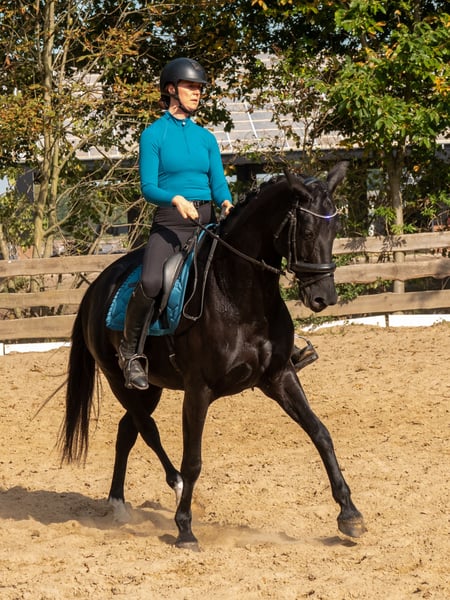 Madison Avenue (hier noemen we haar Moon 🌛) is een super lieve merrie met 3 hele goede gangen, een sterk achterbeen en een mega betrouwbaar en werkwillig karakter. Ze is 8 jaar, zwart en 1.64m. Ze is enorm veelzijdig en heeft al veel van de wereld gezien waarbij ze altijd stabiel en gemakkelijk te rijden is. Op wedstrijd gaan is een groot plezier met haar en zij maakt alles makkelijk (van trailerladen tot prijzen behalen). Met altijd een 7 a 8 voor haar gangen loopt ze nu winstpunten in het M2 en is ze in training al verder (eenvoudige galopswissel en appuyement). Ook is ze weleens op crossterrein geweest, heeft een 80cm-parcours foutloos gesprongen (ikzelf ben geen springruiter), is op endurance (impuls), puzzelritten en talloze buitenritten geweest. Overal is ze gelijk betrouwbaar en niet kijkerig. Ze is echt bomproof te noemen en natuurlijk ook goed verkeersmak. Ze is de liefste knuffelkont en staat als de braafste stil bij zadelen, opstappen, scheren, hoefsmid, etc. Haar vader is de Grand-Prix hengst Dettori, zoon van Desperado, die net als Desperado bekend staat om het vererven van een zeer werkwillig en betrouwbaar karakter, veel kwaliteit en souplesse. Haar moeder liep internationaal eventing CCI2* en 1.20 springen, deze kwaliteiten zijn in Moon nog niet opgezocht vanwege de ontbrekende ervaring van de ruiter. Wel heeft ze in crosstrainingen laten zien betrouwbaar te zijn en een goede sprongkracht te hebben. Moon is een ervaren coachpaard die zeer liefdevol en zacht de juiste reacties geeft aan mensen, om hen te wijzen op wat ze nodig hebben. Tot slot heeft ze ook nog eens ervaring in vrijheidsdressuur en zijn alle trucjes haar vanuit zeer correcte basis geleerd (ze zal dus absoluut nooit schooien of ongevraagd iets aanbieden). Ze heeft veel ervaring met Natural Horsemanship werk en kan ook op touwhalster gereden worden. Afstamming: Dettori (GrandPrix-zoon van Desperado) x Negro Niveau: M2 dressuur met winst, Z in training Karakter: Super braaf, werkwillig en eerlijk – een echt gouden paard Keuringen: als 3-jarige en 5,5-jarige röntgenologisch en ook klinisch volledig goedgekeurd zonder bemerkingen, begin 2025 een lokale bacteriële infectie opgelopen en hiervan goed hersteld Als 5 jarige heeft ze een gezond, groot veulen gehad Geschikt als betrouwbaar leerpaard en ideaal voor de overstap van pony naar paard, is al een paar keer door junioren of manege-ruiters gereden Ben jij op zoek naar een paard waarmee je kan groeien en genieten? Dan is dit jouw kans. Alleen voor een heel goed huisje. Meer info of proefrijden? Stuur gerust een bericht of bel naar 0629622411 (graag even een whatsapp-bericht sturen bij geen gehoor)