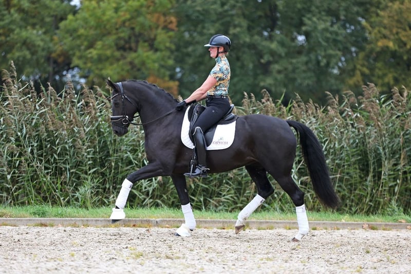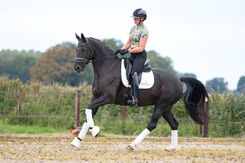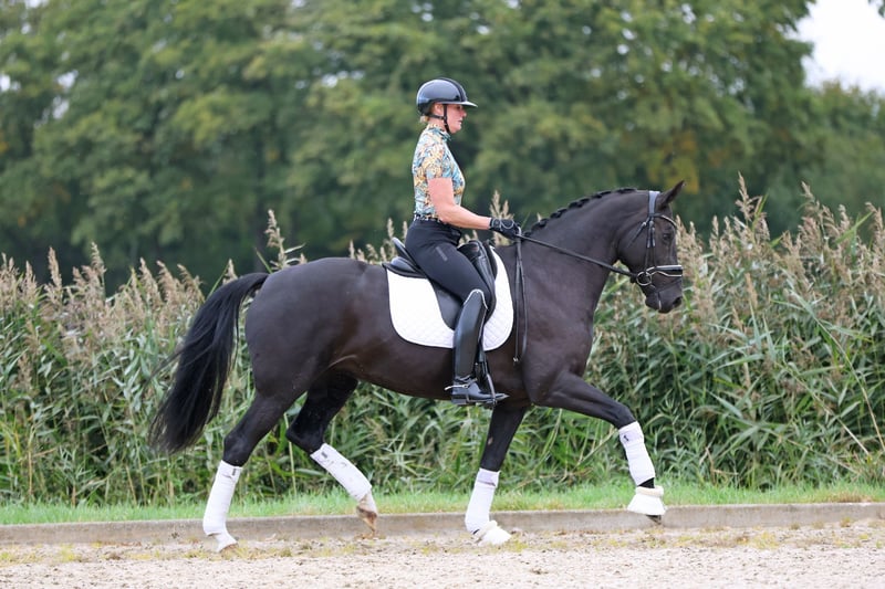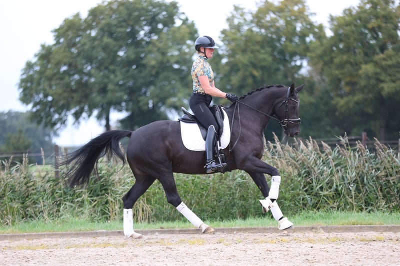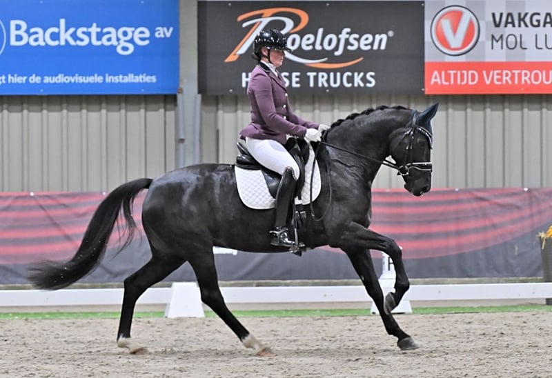 Te koop: Super fijne merrie! Nightgirl is een 8 jarige merrie die we zelf gefokt hebben. Haar vader is een Daybreak die weer afstamt van Desperados. De moeder van Nightgirl is een elite merrie van Jazz en zelf is Nightgirl ster, dus ze zou ook meer dan geschikt zijn om mee te fokken! Nightgirl kent de oefeningen tot en met de Prix Saint Georges en spelenderwijs pakken we ook al een paar pasjes piaffe mee. Op wedstrijden rijden we momenteel in de klasse Zzzwaar. Nightgirl heeft al vele prijzen gewonnen en was vorig jaar ook nog kringkampioen in de klasse ZZlicht. Doordat de jonge aanwas er weer aankomt zou Nightgirl eventueel mogen verhuizen. We hebben echter geen haast met haar, want ze ontwikkelt zich goed en is een heel fijn paard om te rijden en om te zitten. Nightgirl is braaf op wedstrijden, gaat graag op buitenrit en is bevestigd in de oefeningen! Een ruiter met enige ervaring is wel gewenst, want alhoewel zeerg braaf is, heeft Nightgirl wel power! Röntgen goedgekeurd in het verleden. Video op aanvraag! tevens meerdere (jonge) paarden te koop!