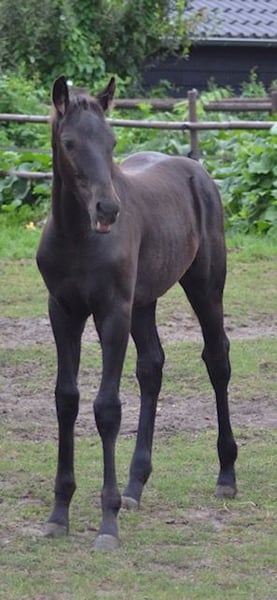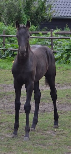 Filly is jet black without any markings. She is tall and long-lined. She is a very luxurious type with good gaits. She has an impressive trot, with a lot of potential for sport and breeding. The other foal in the video is also for sale. We find it very difficult to say goodbye, but due to a lack of space, we unfortunately cannot keep everything ourselves. We hope to find a nice place where her qualities can be further developed.