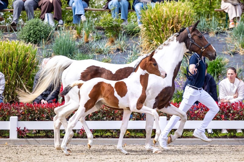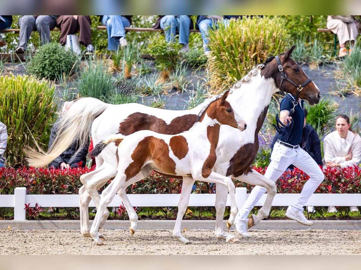 Weekend Love (Desigual x Love For You) Stute, geboren am 16.03.2026 Die Mutter von Weekend Love, „Hora Matutina“, ist eine Zuchtstute des Hengstes Love For You und Weekend Love (Desigual x Love For You). Für uns hat sie einen hohen Stellenwert, da sie die letzte Nachkommin der leistungsstarken Stute Iquita (Rossini x Zilverster) ist, einer Pref-Prestatiemerrie. Zudem ist sie eingeteilt in den Pedigree einer weiteren leistungsstarken Stute aus unserer Linie, nämlich der Leistungsmerrie Louise (Fruhling x Pericless xx). Damit wollen wir die Gene dieser Linie fest verankern. Einige herausragende Nachkommen dieser Linie sind unter anderem der kürzlich vom KWPN und NRPS gut gekörte Hengst Triple Colours (Energy x Henkie), Love For You (ZFDP gekört), der niederländische Meister und Weltmeister Tsambikos (Larino) (KWPN gekört), Samber (Pericless xx), Caramba (Oscar) – ein schwerer Tourenhengst, sowie natürlich der Halbbruder von Weekend Ranger (Kaiman), Finalist bei der VSN und L2-Finale. Der Vater von Weekend Love ist der Premiumhengst Desigual, der, wie es scheint, genau wie sein Vater weiß, was Vererbung bedeutet. Sein beeindruckender Bewegungsmechanismus ist deutlich in „Weekend Love“ sichtbar. Auch Desigual hat dieses Bewegungsmuster exakt von seinem Vater Debutant geerbt, in dessen Blutlinien gleich sechs Grand Prix-Hengste vertreten sind, deren Abstammung man in den Niederlanden kaum findet. Das macht Weekend Love sowohl für den Sport als auch für die Zucht so einzigartig. Weekend Love ist ein einmaliges Fohlen, das wirklich alles mitbringt: einen hervorragend verankerten Bewegungsmechanismus, ein fantastisches Temperament und zudem eine einzigartige Farbe, die sie sicherlich weitergeben wird – mit sieben Generationen Scheckung in der Mutterlinie.