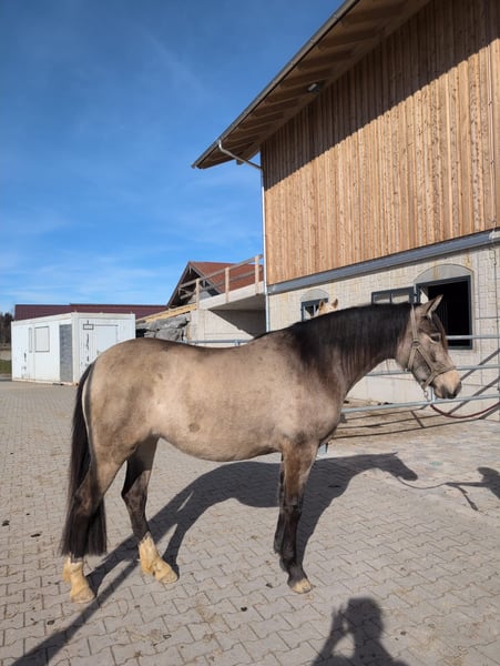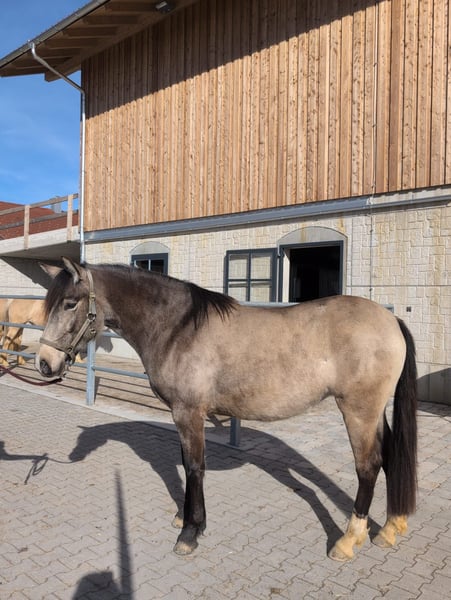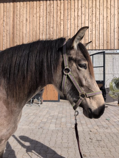 Zum Verkauf steht eine bildschöne Leonharderstute der F3-Generation mit 75% PRE Anteil. Geboren im Jahr 2023, besticht sie durch ihre charmante Erscheinung und ihr freundliches Wesen. Mit ihrem eleganten Buckskin-Farbschlag und einem aktuellen Stockmaß von 156 cm ist sie sowohl optisch als auch vom Charakter her eine ideale Begleiterin für den Freizeitbereich. Violetta wächst artgerecht im Herdenverband auf und kennt Tierarzt sowie Hufschmied. Sie liebt es geputzt und gekrault zu werden. Diese junge Stute ist sehr neugierig aber noch etwas unsicher, weshalb sie eine Bezugsperson braucht die ihr Vertrauen und Sicherheit schenkt. Wenn sie diesen Menschen findet geht sie durch dick und dünn. Violetta ist noch roh, wird aber regelmäßig laufen gelassen. Der Leonharder ist bekannt für seine robuste Konstitution, seine vielseitigen Einsatzmöglichkeiten und sein freundliches Wesen. Mit ihrer charmanten Ausstrahlung und ihrem angenehmen Charakter ist diese Stute eine echte Bereicherung für jeden Freizeitreiter. Bei Interesse oder weiteren Fragen stehen wir Ihnen gerne zur Verfügung. Vereinbaren Sie einen Termin, um diese wunderbare Leonharder-Stute persönlich kennenzulernen!