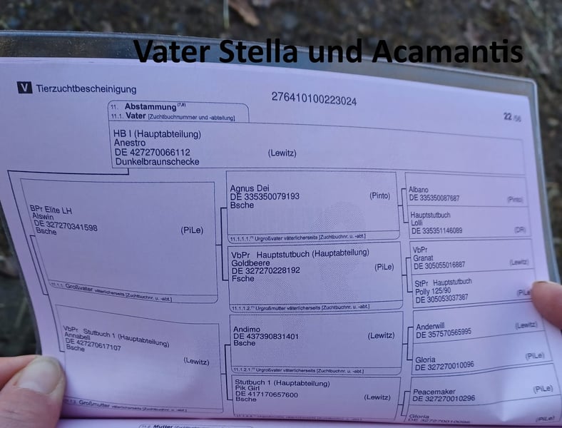 Stella ist eine im Mai 2024 geborene Stute . Sie wird übers Endmass groß werden und ist ein Farbwechsler hat eine gute Abstammung und im ZFDP eingetragen. Stella kennt das Fohlen-ABC Spaziergänge und Hänger fahren sind für sie kein Problem. Abstammung kann den Bildern entnommen werden. Preis: 3550 Euro Acamantis ist ein im August 2024 geborener Hengst . Er ist prämiert worden hat eine gute Abstammung und im ZFDP eingetragen. Acamantis kennt das Fohlen-ABC Spaziergange und Hänger fahren sind für ihn kein Problem. Abstammung ist bei den Bildern. Kann auf Wunsch gegen Kostenübernahme gelegt werden. Preis: 3350 euro