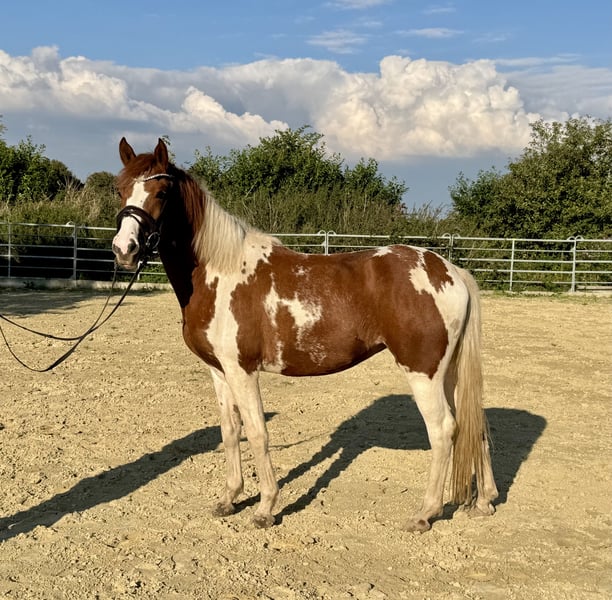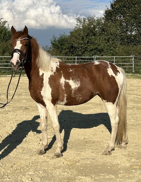 Really lovely pony mare for sale in a sporty context. Stylish, beautifully marked - simply unique! La Kaitana is backed and already behaves well with children - but of course, she needs further training. Due to her size and build, she can also accommodate larger riders. She is extremely fearless, uncomplicated, and a true overachiever: she always tries to please her person. Good basic gaits, has never been sick. Her father is a performance stallion, receiving a 10.0 for character and demeanor at the stallion performance test!!!! (For performance and jumping 9.0) La Kaitana is a great leisure partner, she can certainly excel in competitive events and can also be used as a breeding mare due to her very good lineage. On her mother's side, all mares are elite mares, and since she is only 3 years old, there is certainly nothing standing in the way of her presentation for the state premium eligibility.