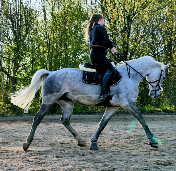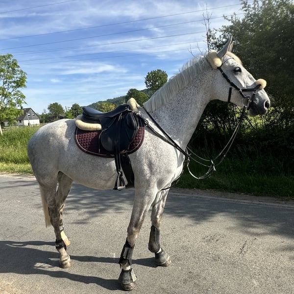 Lipizzaner Stute – Jahrgang 2013 – sportlich, loyal, mit viel Temperament Zum Verkauf steht eine ausdrucksstarke Lipizzaner Stute (2013) mit viel Go und Persönlichkeit. Sie ist geritten und wurde freizeitmäßig bis 1,10 m gesprungen. Sowohl auf dem Platz als auch im Gelände hat sie große Freude am Springen. Sie gibt immer ihr bestes und will gefallen. Sie lernt super schnell und auch schwere Übungen mit Leichtigkeit. Sie denkt gerne mit und überzeugt dabei durch ihre Motivation. Tunierambition ist gegeben! Besonders liebt sie lange, ausgiebige und vor allem schnelle Ausritte – Schritt-Schlendern ist nicht ihr Ding. Am liebsten läuft sie im Galopp und braucht einen Reiter, der Spaß an Tempo und Energie hat. Dabei ist sie aber immer Händelbar. Charakterlich ist sie kein Anfängerpferd. Sie ist temperamentvoll, sensibel und bindet sich stark an eine Person. Hat sie einmal Vertrauen gefasst, geht sie für „ihren“ Menschen durchs Feuer. Häufig wechselnde Reiter mag sie nicht – sie ist ein echtes Ein-Personen-Pferd. Gesundheitlich: Sie hat Asthma, ist jedoch bei konsequenter Haltung auf Heulage und mit Inhalator aktuell symptomfrei und voll belastbar. Eine dauerhafte Haltung mit Heulage sowie mindestens einer Paddockbox wird empfohlen, um ihren Gesundheitszustand stabil zu halten. Sie kennt Offenstall, Box und Paddockbox. Abgegeben wird sie wenn gewünscht inklusive komplettem Zubehör: Deckenpaket (Bucas-Decken), Passier Springsattel, Flexineb Inhalator und weiteres Equipment. Ein neuer Dressursattel kann gegen Aufpreis dazu verkauft werden. Preis: 4.000 € VB inklusive Zubehör Preis ohne Sattel etc nur mit Inhalator 2.500€ Kein Notverkauf. Platz vor Preis. Sie wird nur in passende, erfahrene Hände abgegeben, die ihr Temperament zu schätzen wissen. Standort Hannover