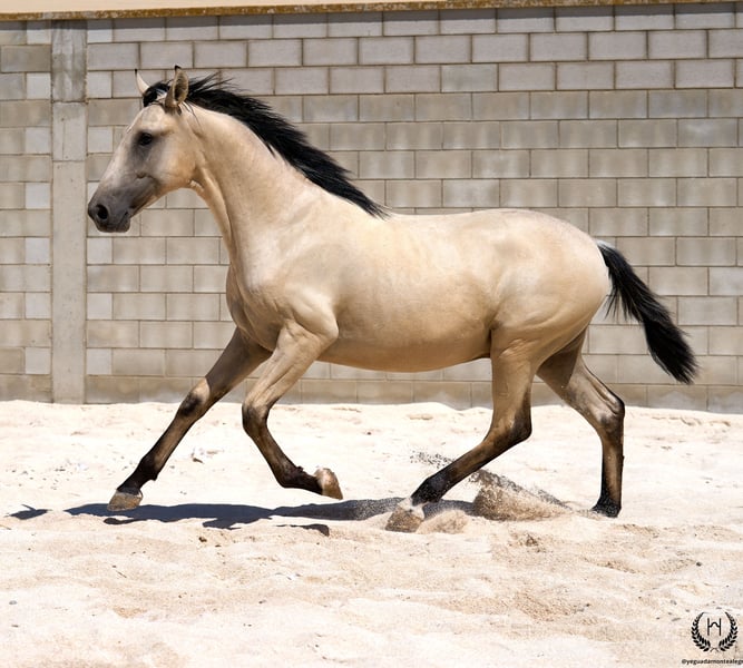 🐴 Uranio is a spectacular Lusitano colt with a very light golden buckskin coat, black points and a white star on his forehead; black mane and tail with a frosted effect. Born on 3 July 2024. Height at the withers: 1.55 m. He stands out for his large frame and baroque, highly breed-typical conformation. Very correct limbs. Sloping shoulders, rounded hindquarters and excellent bone density; convex (ram-nosed) profile, extremely typical of the breed, with very lively and expressive ears and eyes. 💪 With an imposing physique and harmonious, fluid and elastic movement, Uranio combines beauty, nobility and functionality. He will be an ideal young horse for classical dressage as well as for hacking, leisure riding and family enjoyment. 🩺 Health guaranteed: Any veterinary examination accepted. Dewormed, with up-to-date documentation and EU passport. 🔬 Coat genetics: E/x A/a CRcr – Buckskin. 🚛 National and international transport available with specialised companies. 📲 Contact: 🟢 WhatsApp: +34 639 522 420