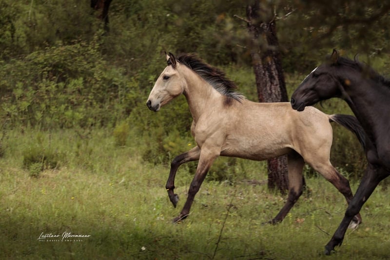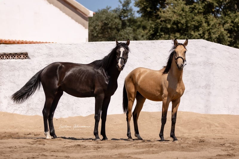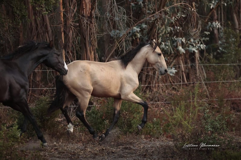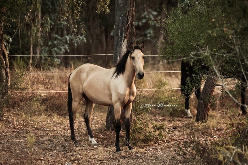 Elegant Lusitano young star in a gold coat Characteristics: - Breed: Lusitano - Sex: Stallion - Year of birth: 2023 - Color: dun - Height: 161 cm estimated This young stallion impresses with his elegant appearance and his impressive potential, which he already has as a 1-year-old. He is ideally suited for ambitious riders who are looking for a loyal partner for dressage sport. His sire HERDEIRO DA BROA is licensed with 72 points and his dam with 74.5 points, so I can also see him being used for breeding. His sire can be seen in the last 3 pictures. He is not only golden on the outside, his character is also made of gold. At the moment he lives freely on the campo according to his age and enjoys the time with his buddies. It goes without saying that he is extremely friendly. I can send you more pictures and videos if you are interested.