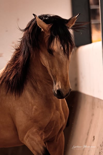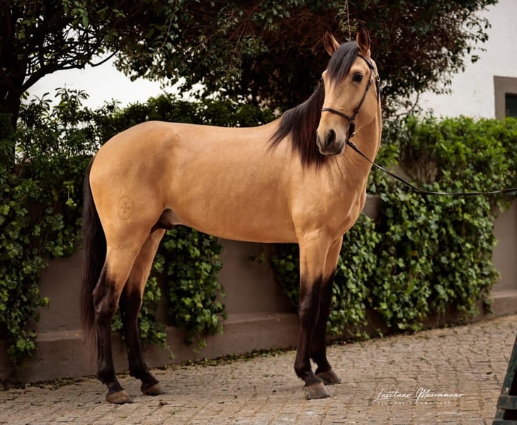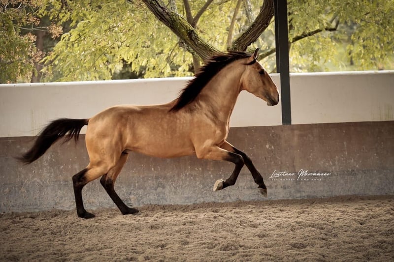 This young Lusitano stallion has only been ridden for a few weeks and is already performing exceptionally well. He is very cooperative under the saddle, knows the basics, and is now beginning to go on his first trail rides. On the ground, he is extremely friendly, easy to handle, and always eager to do his best. Santo Isidro impresses not only with his temperament but also with his beautiful coat: a typical buckskin measuring 15.5 hands with an expected final height of around 15.8 hands. He is compact, athletic, and ideally suited for Working Equitation. His very good canter stands out, demonstrating balance, uphill tendency, and potential for further training. He was raised on a 600-hectare property in a young stallion herd with peers at the stunning Jupiter Classical Dressage estate, which also belongs to the handsome gelding. He can be visited at any time. If you are looking for a young, honest Lusitano stallion with a fine character and great prospects, Santo Isidro is definitely worth getting to know.